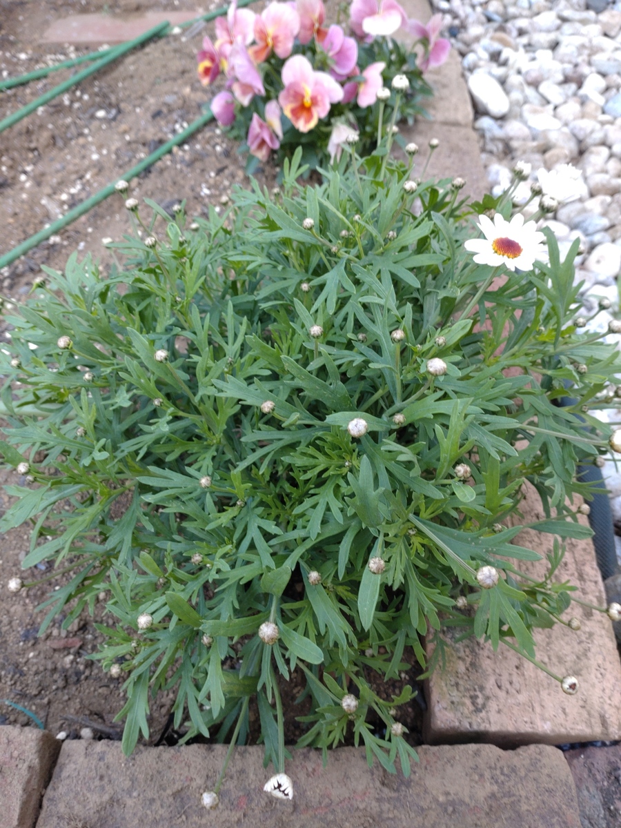挿し芽が、余ったので庭の隅に冬越し実験で植えといた名無しマーガレット。防寒対策一切無しでも冬越しできた(千葉県北西部)