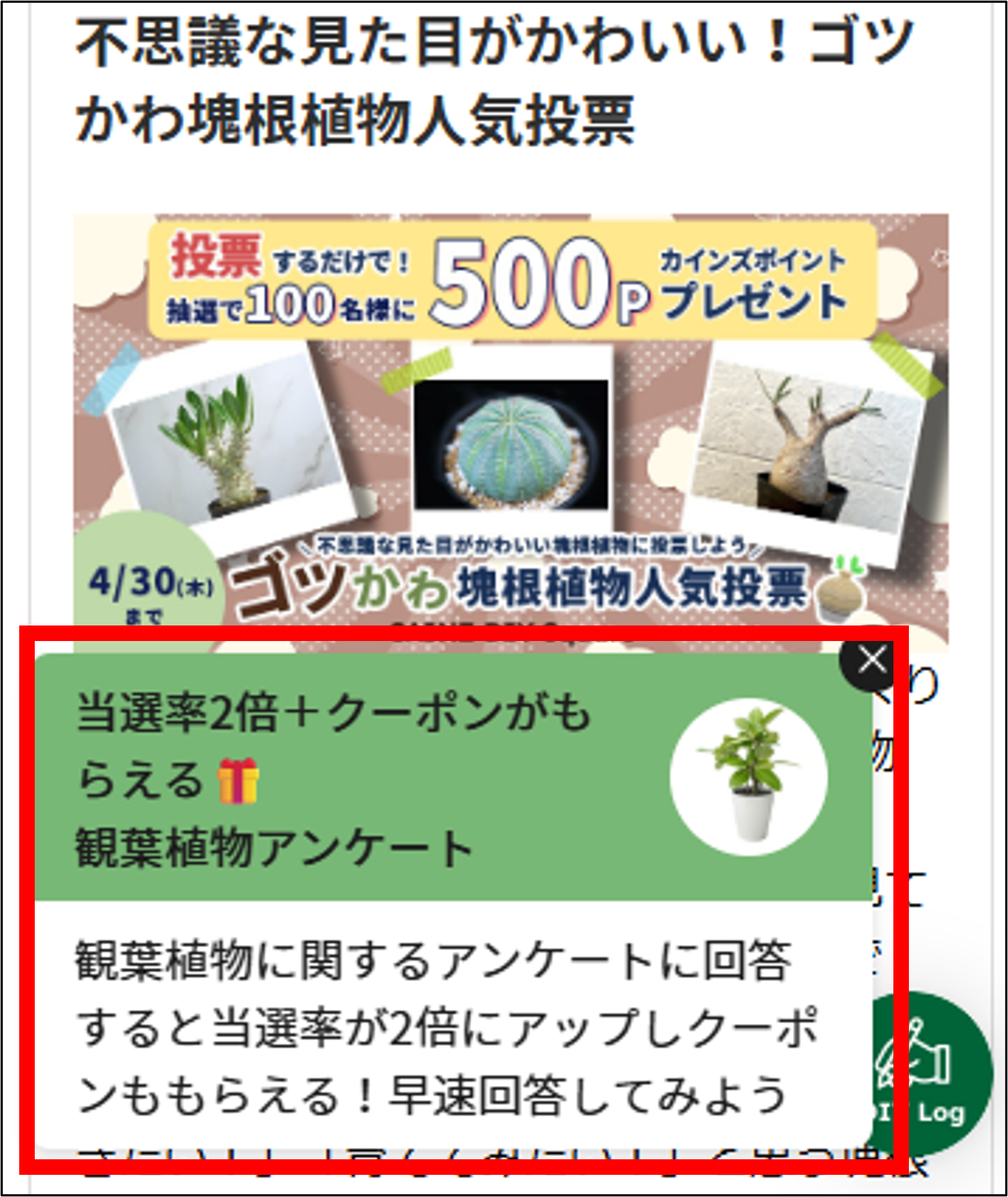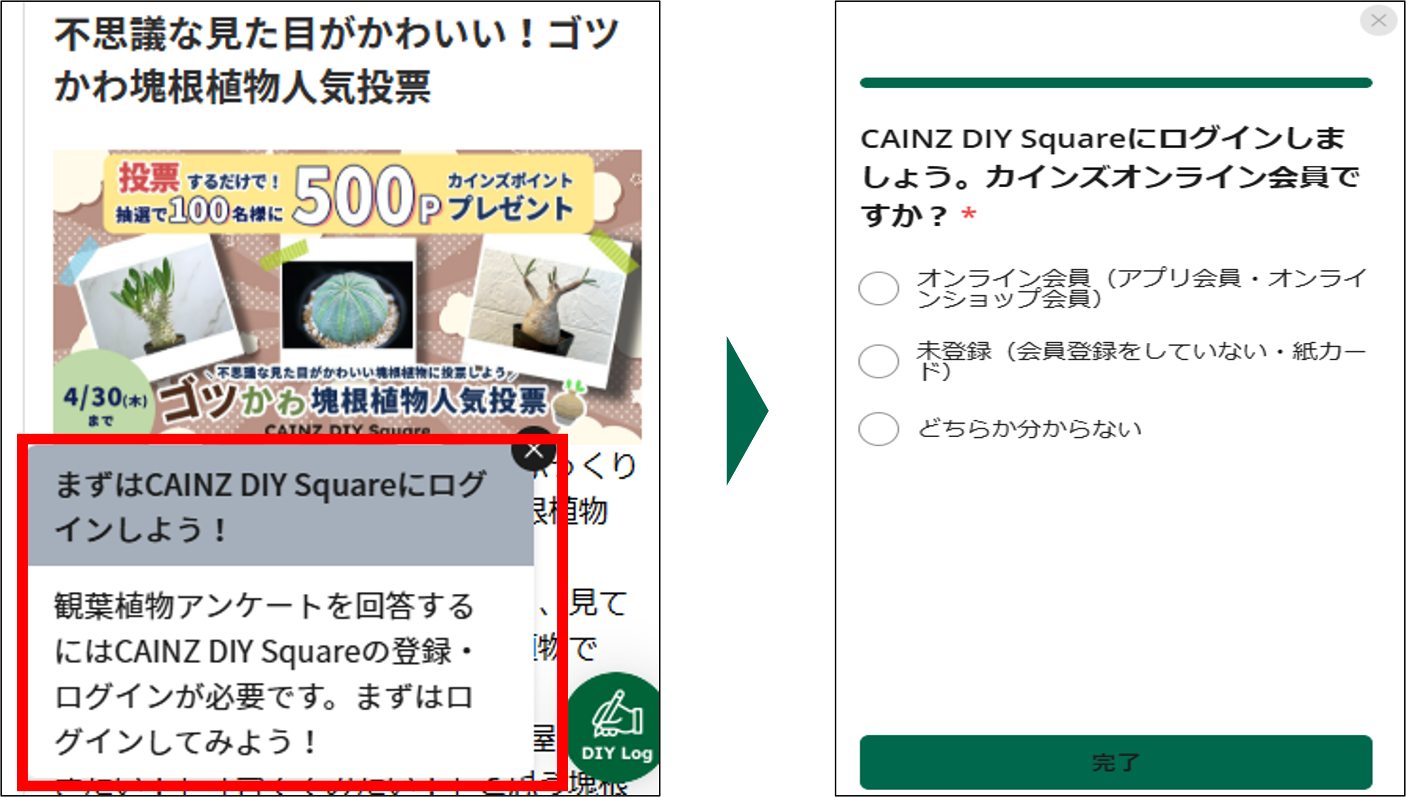 CAINZ DIY Squareにログインし、左下に表示されている「観葉植物アンケート」のポップアップをタップ ※「観葉植物アンケート」のポップアップはCAINZ DIY Squareにログインをしないと表示されません |