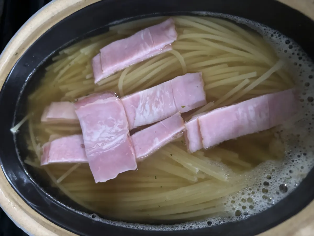 ![]() 器に水とオニオンスープ、パスタ、ベーコンをいれる。600W 9分