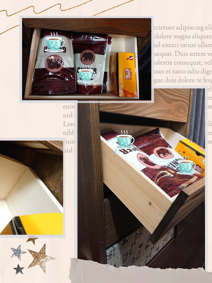 左下の画像ように、上の引き出しがのってる木材と、下の引き出しの箱のパーツ上部までが結構離れています。