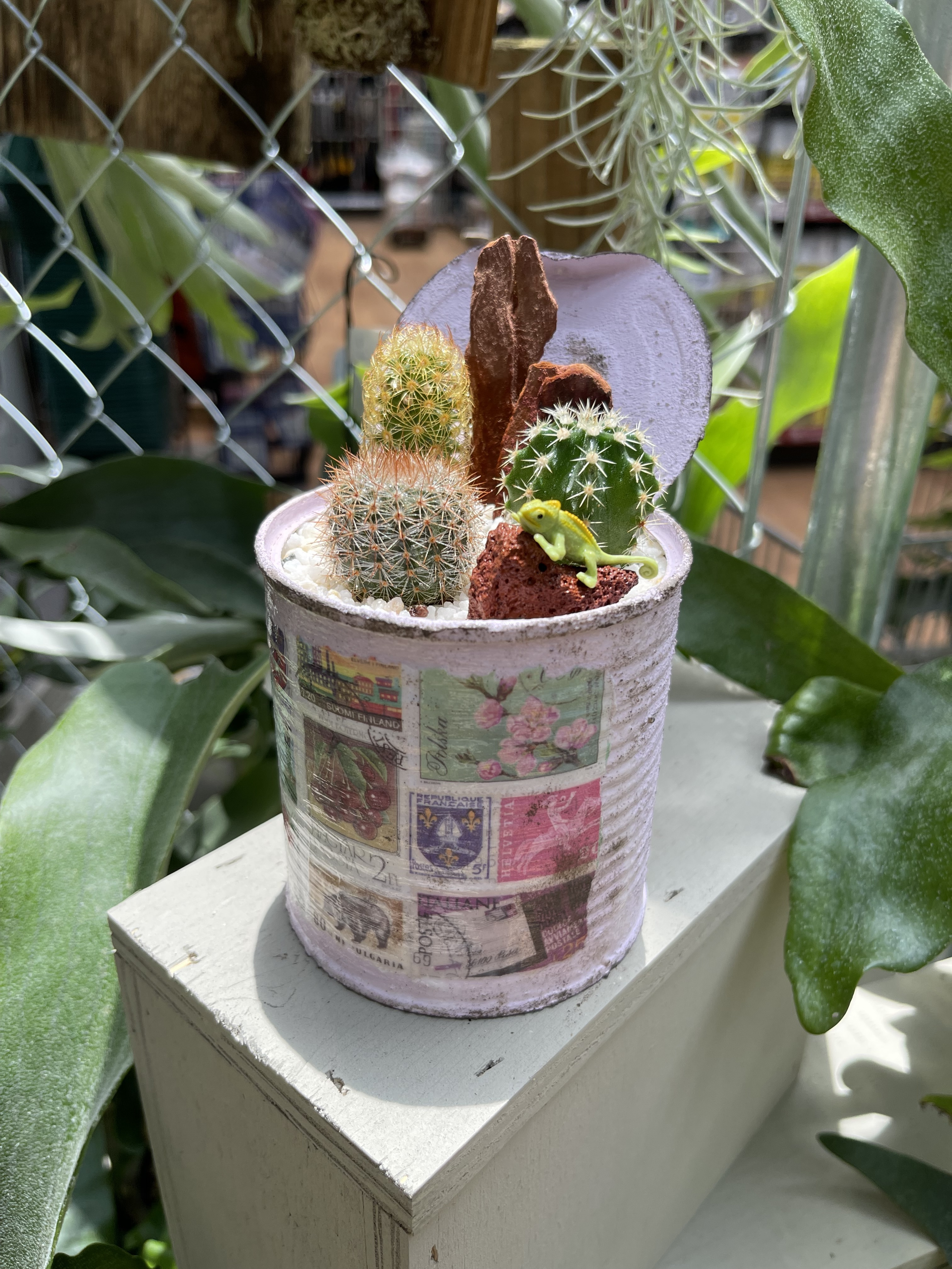リメ缶もサボテン🌵も素敵💓石の上のカメレオンが寄せ植えを更に盛り上げてくれますね