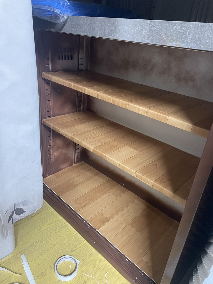 ラックの中が少し明るい感じになりました。クッションフロアなのでシンナーが垂れたらダメでしょうね。