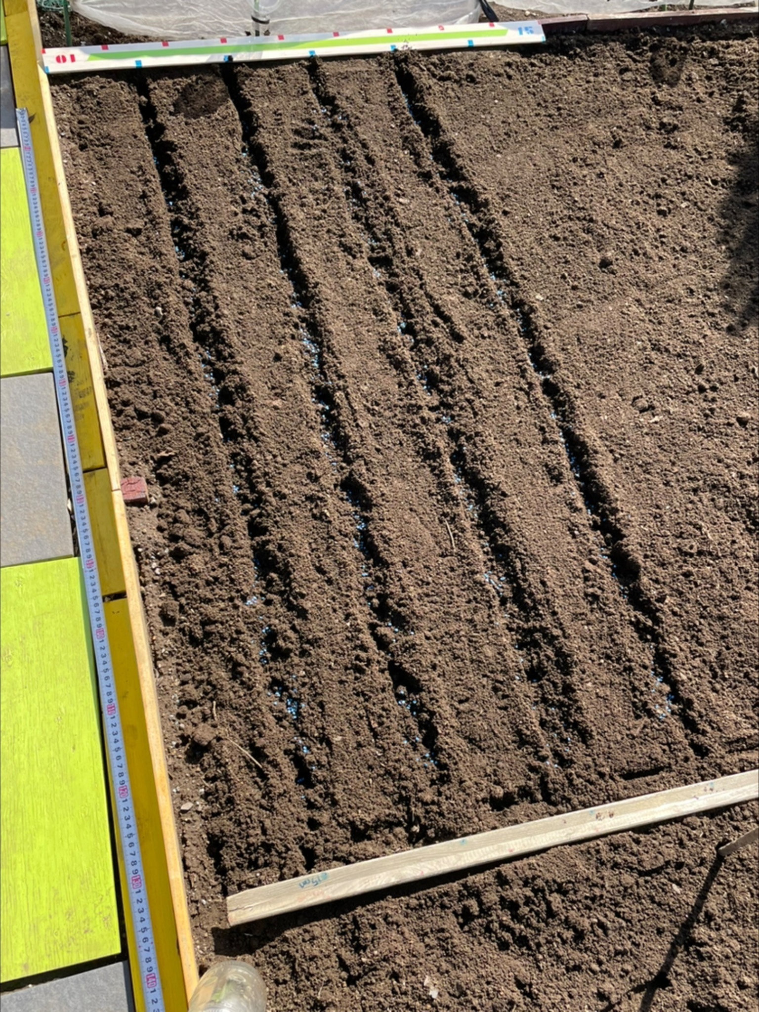 グリーン用物差し(リンク→ https://diy-square.cainz.com/announcements/3z0lrrgxdkispx0d )を目安に、スジ間を15cmに4列で種蒔きしました。