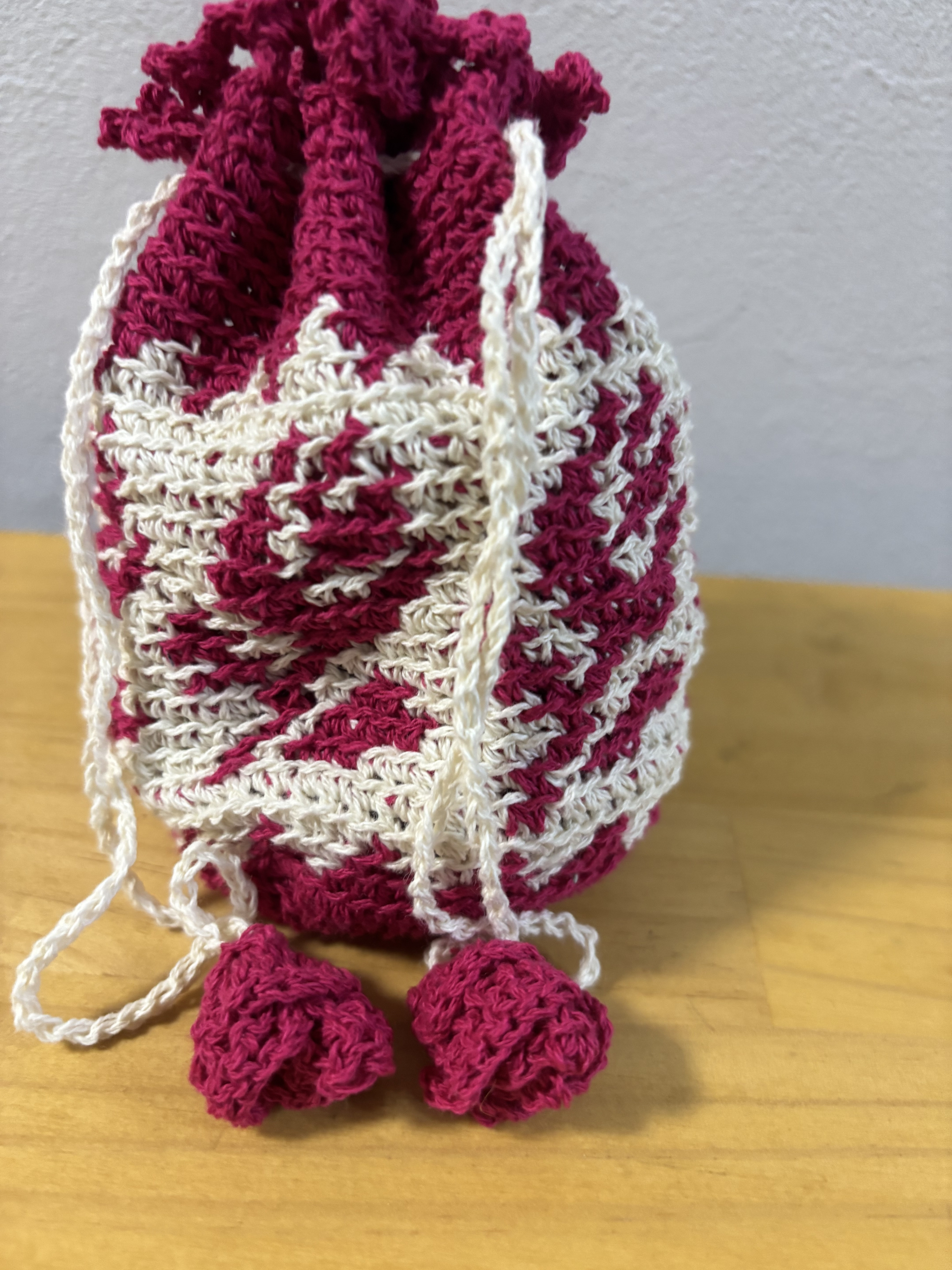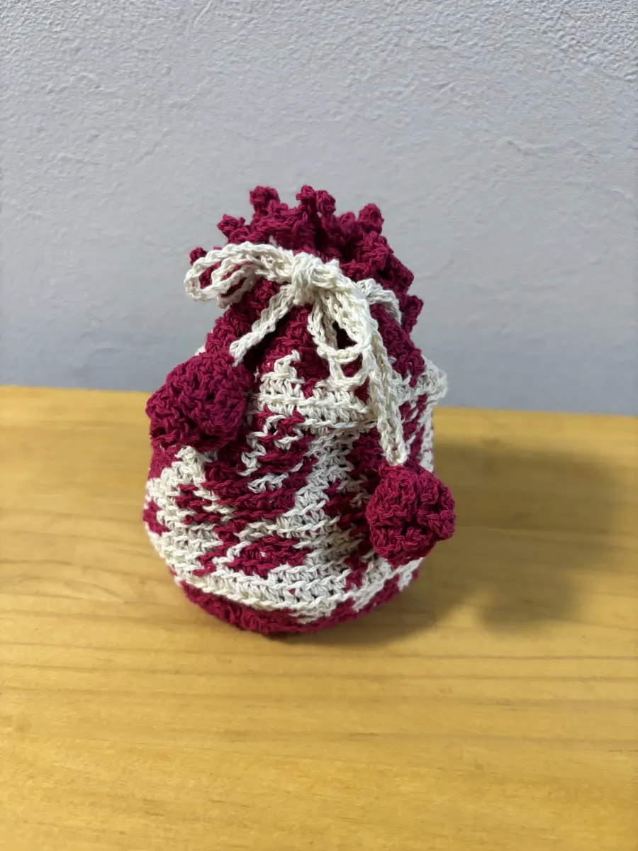 投稿を表示編み込みのお花と紐の先の飾りがアクセントで可愛い巾着ですね😊🎶