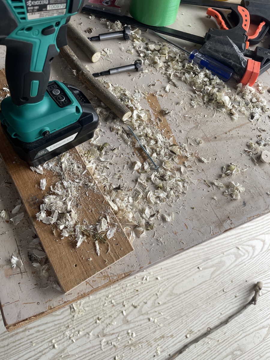 木材をカットしたり、枝を通す穴を開けたり意外に大変(;^_^A