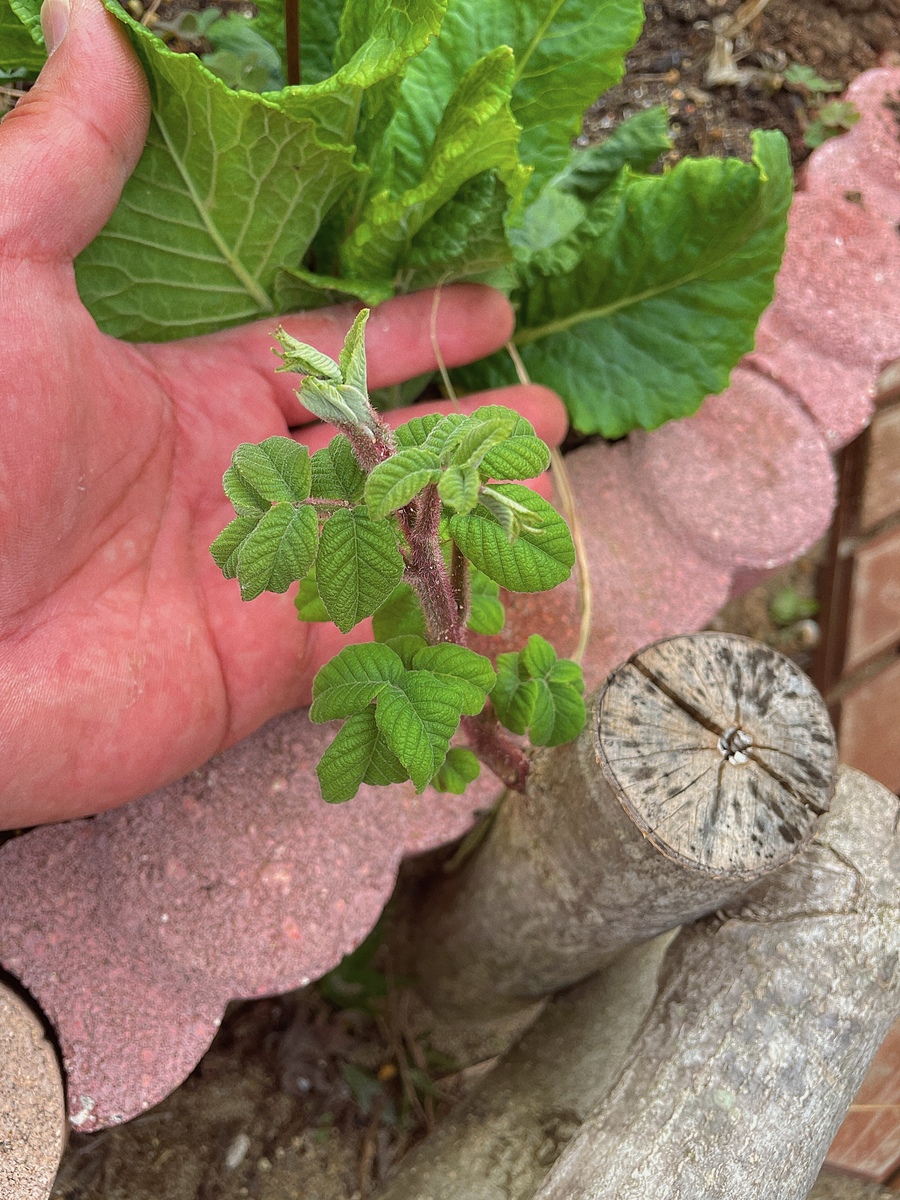 以前作成した木の柵ですが、なんとその木から新芽が出てきてました(笑)