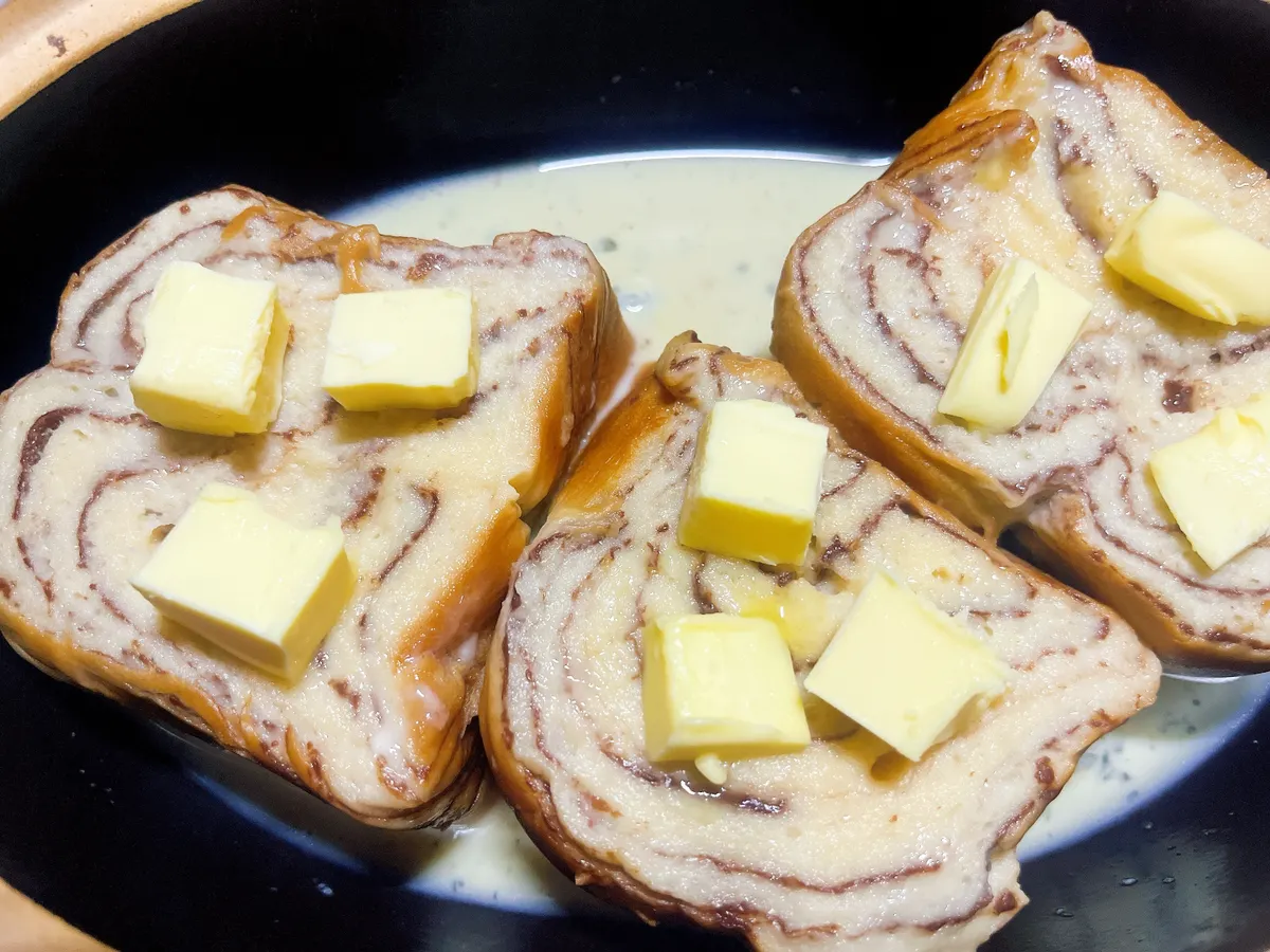 卵液が染み込んだら、バターを細かくしてパンの上に並べます。