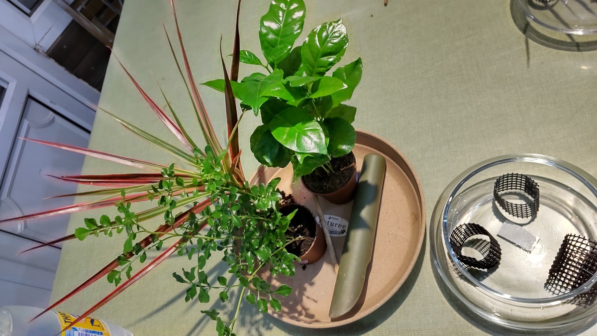 ガラスの器の中の黒のネット、コレで観葉植物さんを支えるので、大事なコです( ・`ω・´)ノ