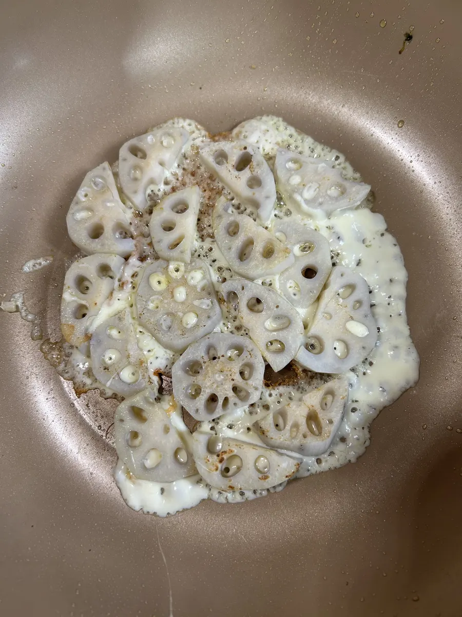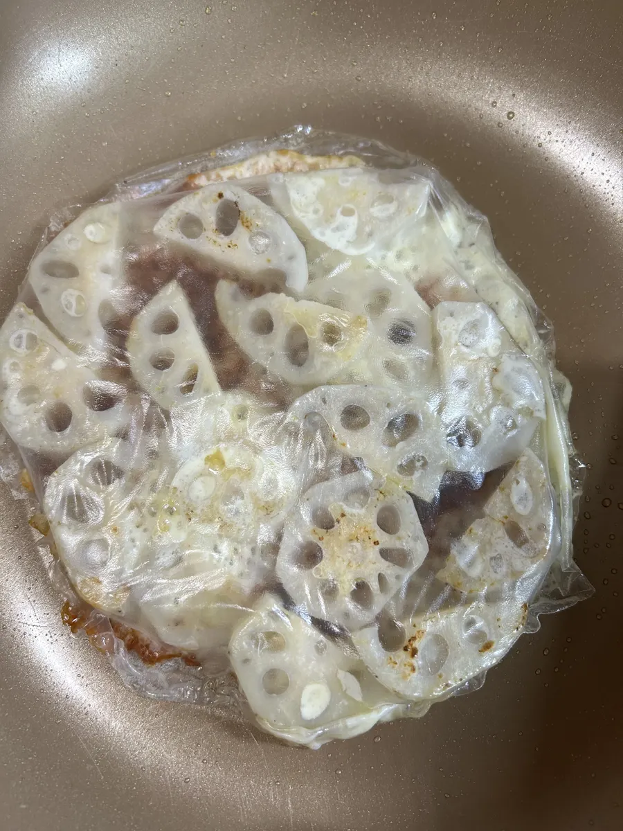 スライスチーズをフライパンに広げてその上にレンコンを並べます