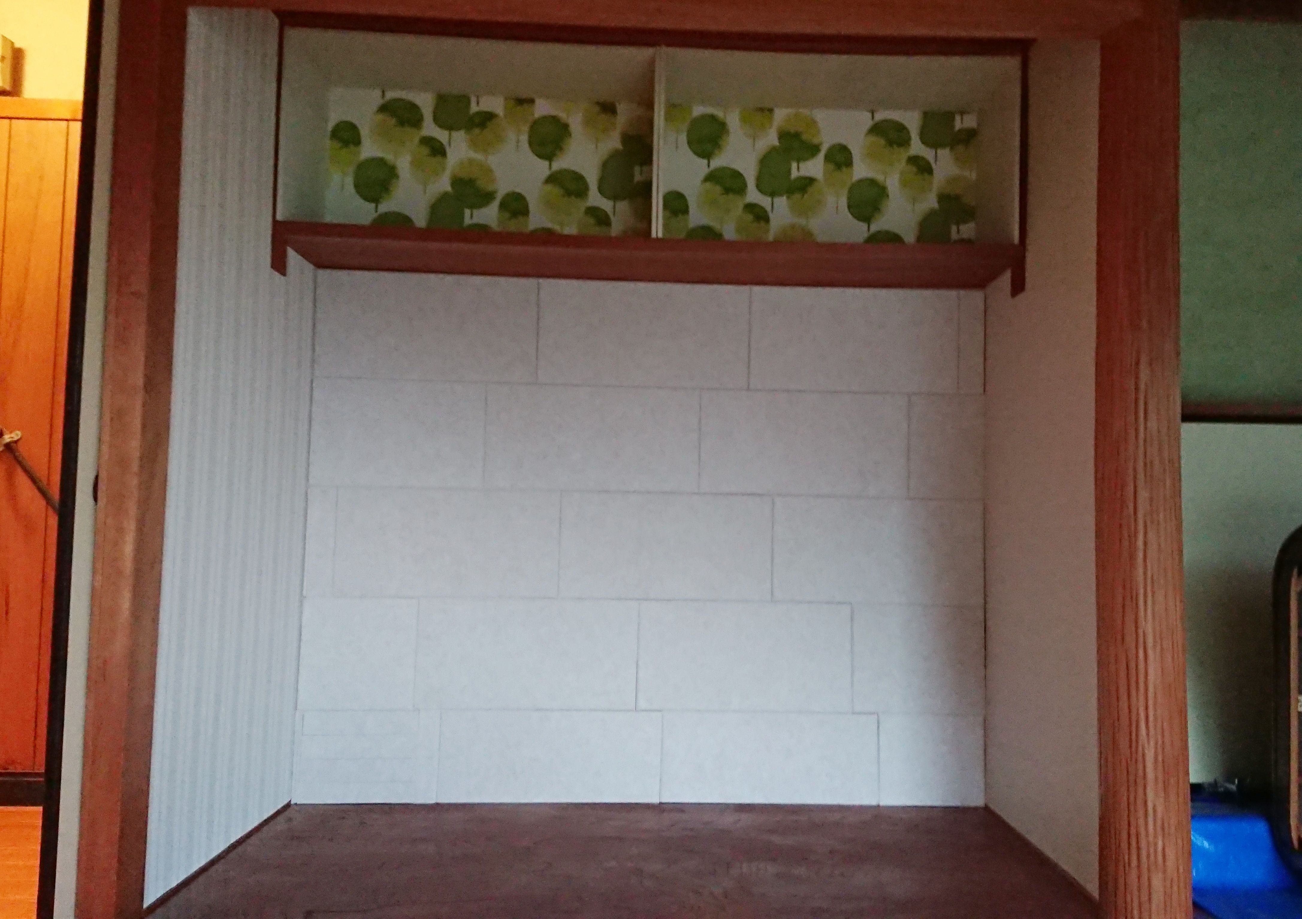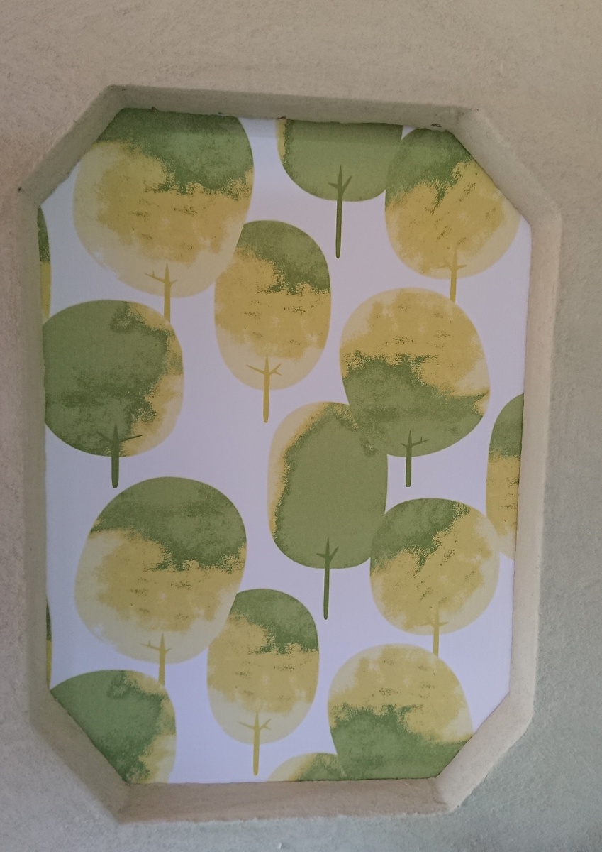 真ん中壁にあった明かりとりの窓は裏から壁紙を貼って、なんちゃってニッチ風にしました☺️