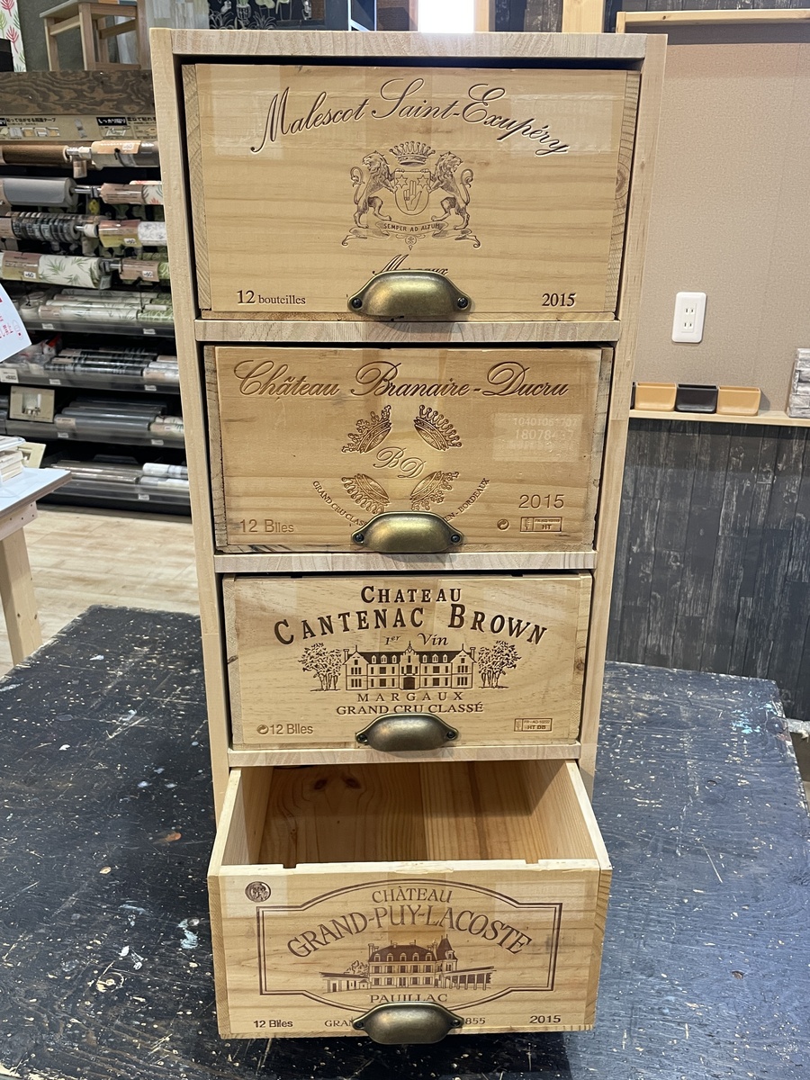 投稿を表示それぞれ柄の違うワイン箱のチェスト素敵ですね☺️取っ手もワイン箱にピッタリな感じ👍