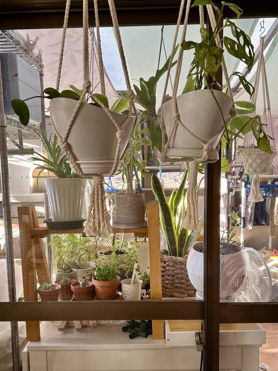 夜は気温が下がるため、➖5℃くらいまで大丈夫なグリーンはサンルーム内に、弱めなものは室内にハンギングしています。