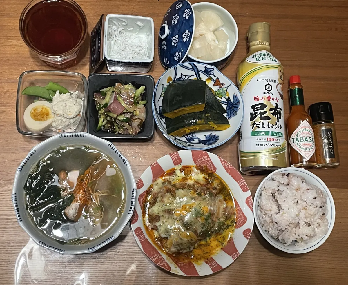 【ゴリん家飯6️⃣4️⃣半額三昧で鰤と赤海老の漬け・南瓜煮・海老出汁味噌汁😋🐟🦐🎃✨】