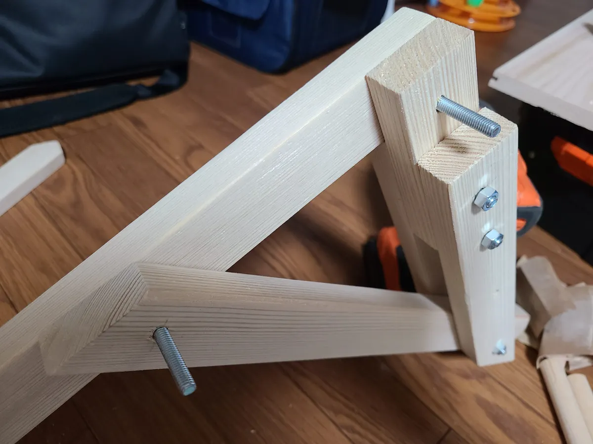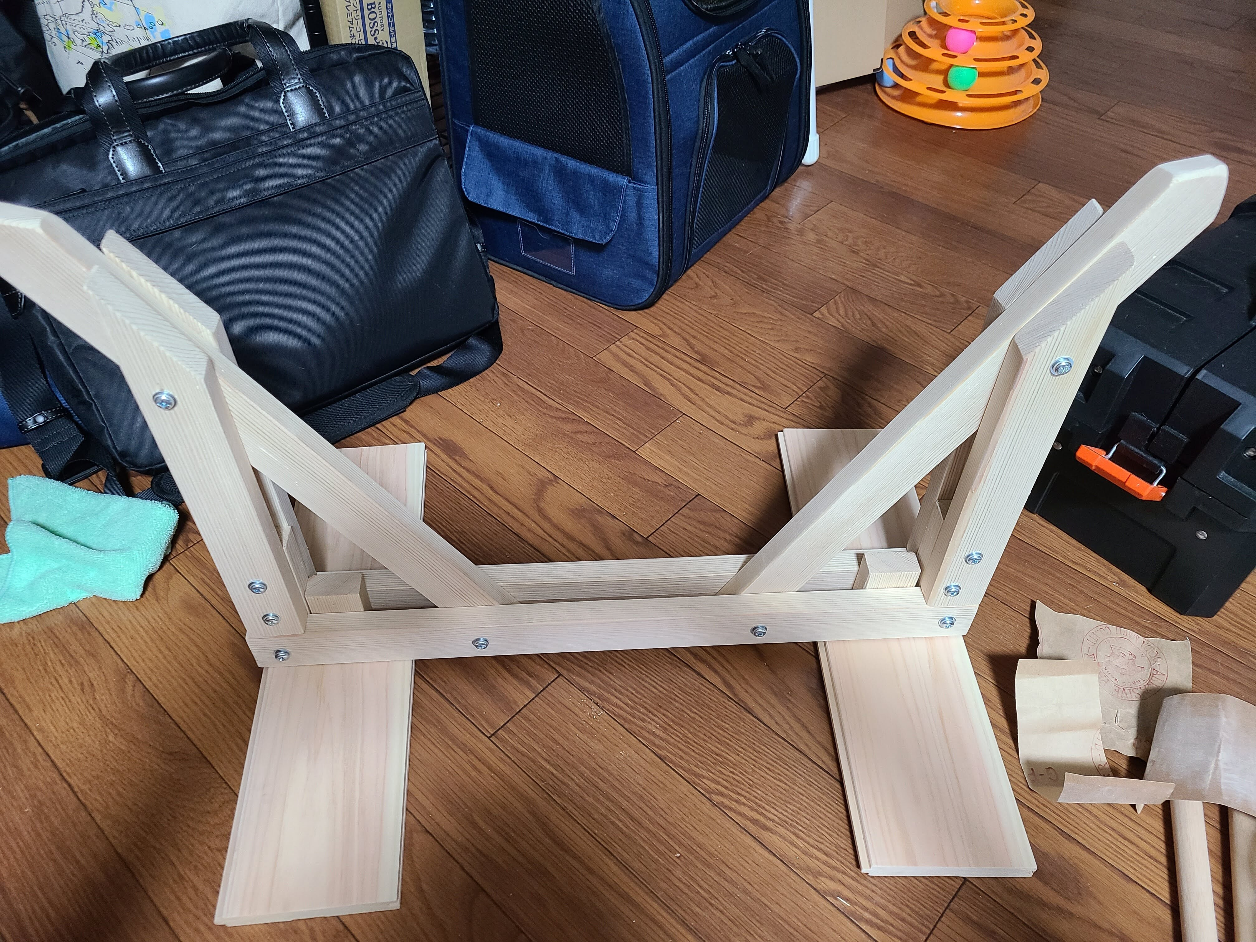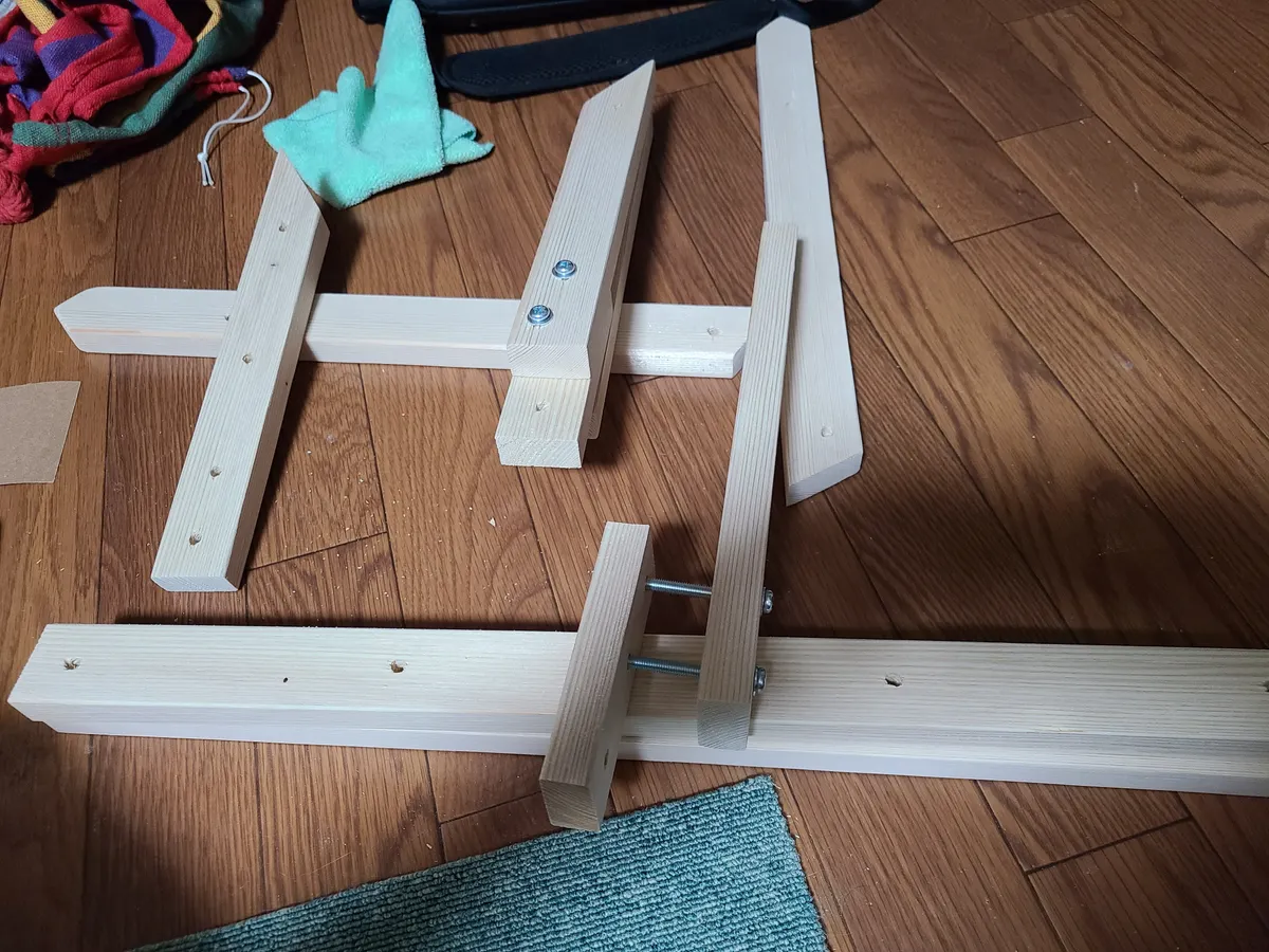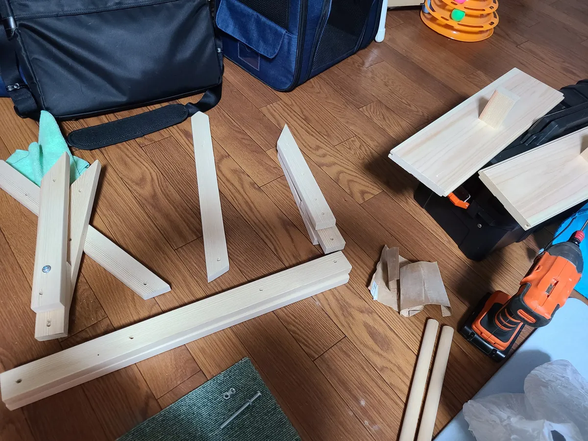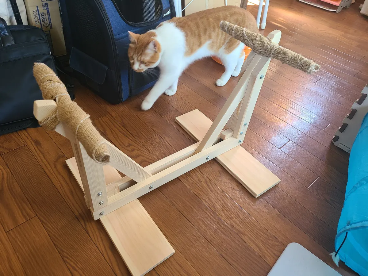 赤松KD材15×40と板材、20mm丸棒、M6ボルトをカインズさんで購入し、猫用のハンモックこと