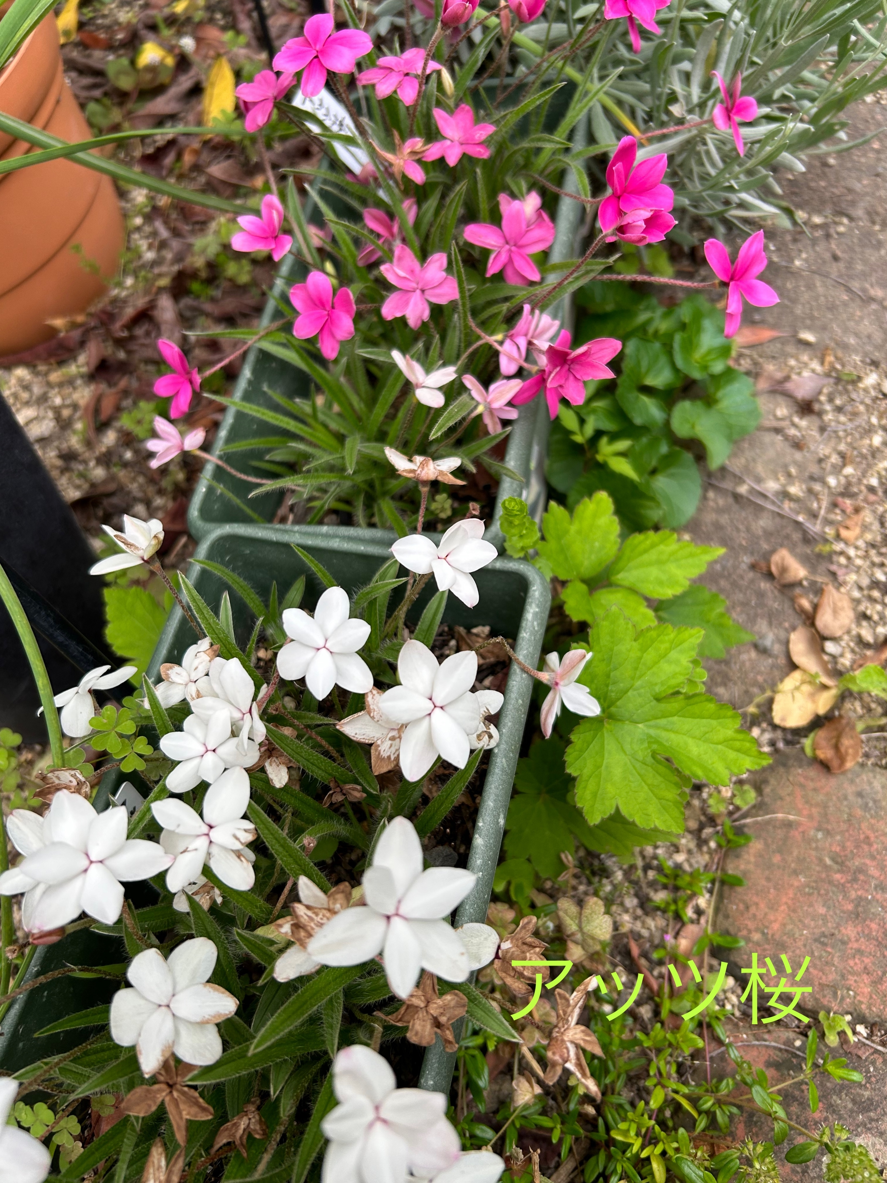 紅白でのアッツ桜です。数年前にそれぞれを地植えから掘り起こして、一つづつ鉢に植え込みました。