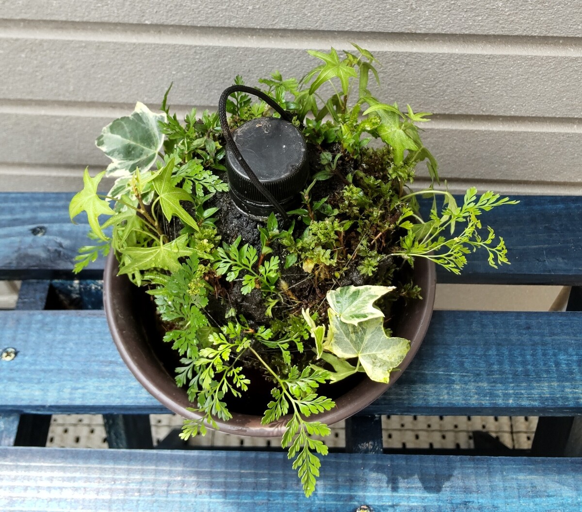 ボトルプランターは中から水が染みだしてくる仕組みになっていて さらに霧吹きをかけてお世話をするのですが 暑すぎて弱ってしまったみたいです😱
