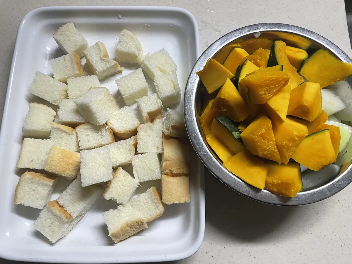 材料②の玉葱・南瓜、材料⑤の食パンを適当にカットしぃ〜🎃🧅🔪✨