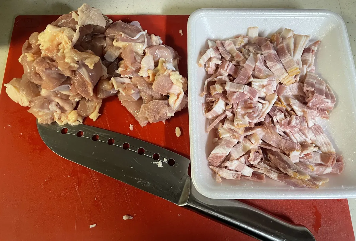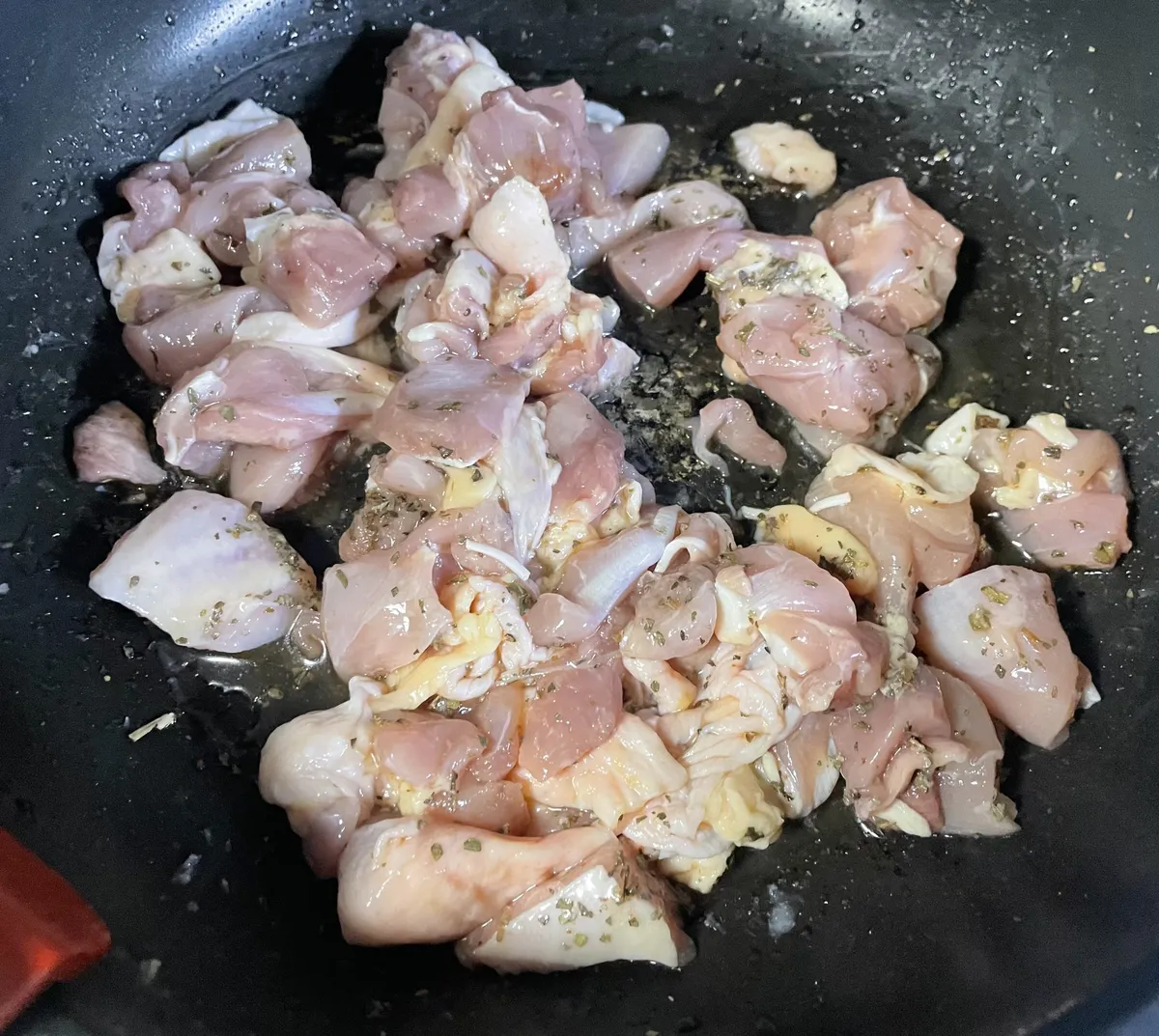 材料①の鶏ももを一口大にカットしてぇ〜🐓🔪✨