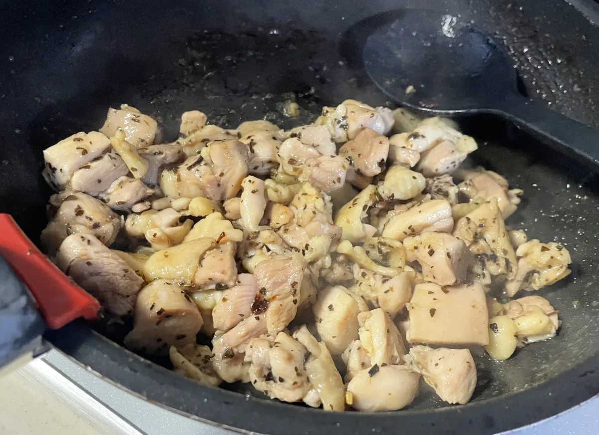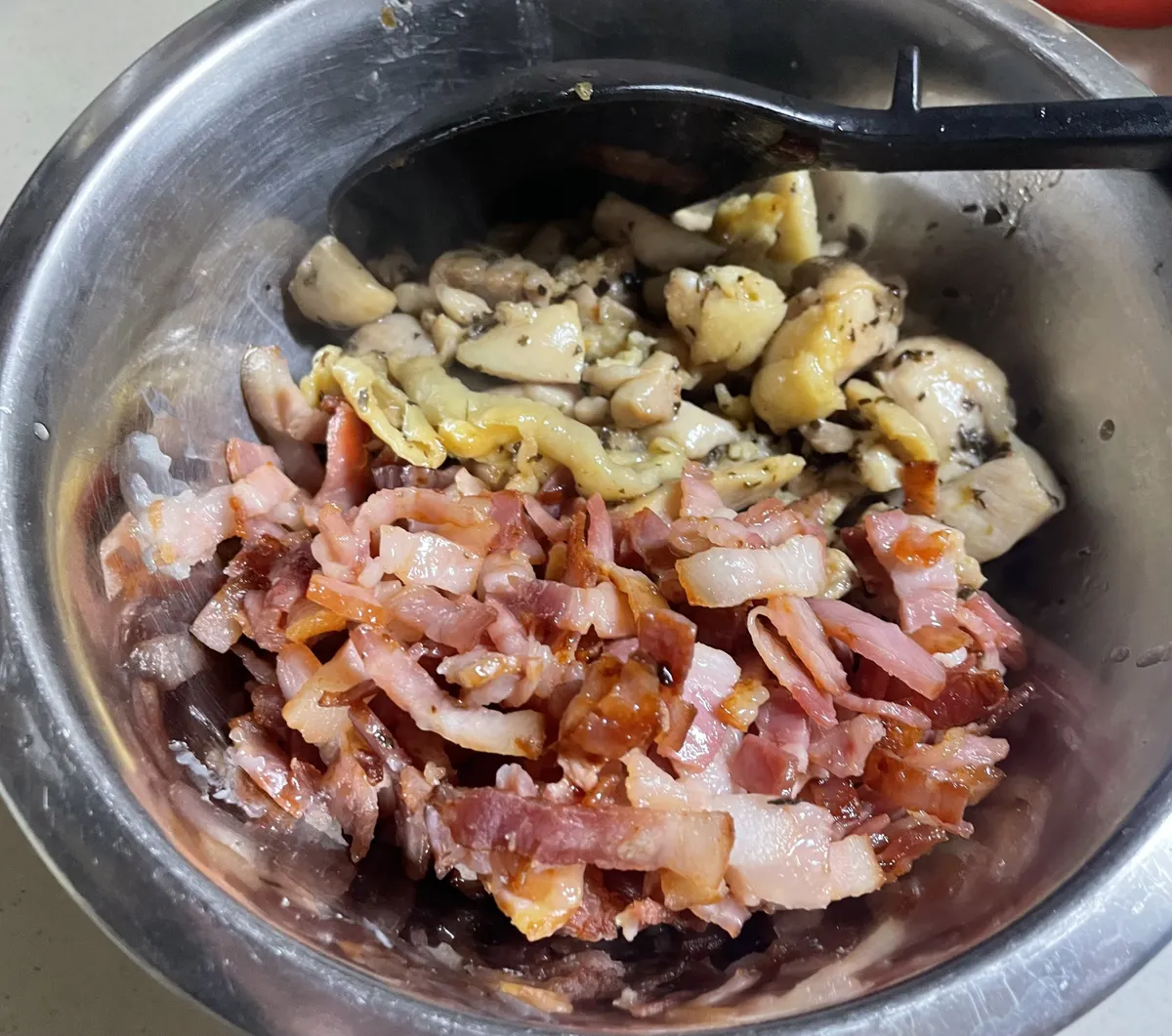 ベーコンをフライパンで炒めてカリッとさせたら、美味しい脂が出たフライパンに鶏ももと調味料①を加えて暫く味を馴染ませてから炒め、ボウルに移動させるぅ〜😁👍🥓🐓🍾🌿🍳🔥➰🥣✨