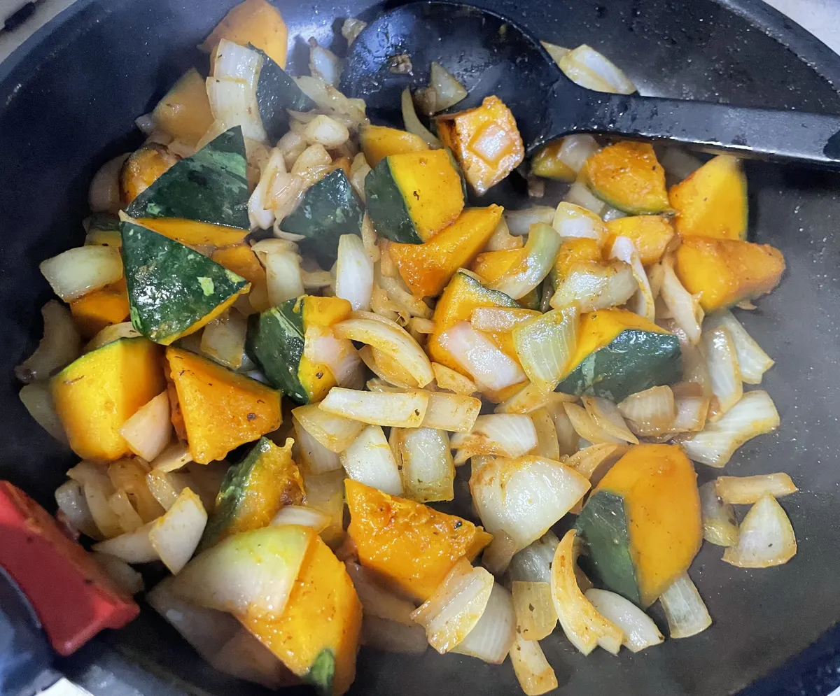 そんたら材料②の南瓜・玉葱に脂を吸わせる様にしながら炒め、玉葱がしんなり&南瓜にチョイ焼き目が付いた頃合いでぇ〜🧅🎃🍳👀✨