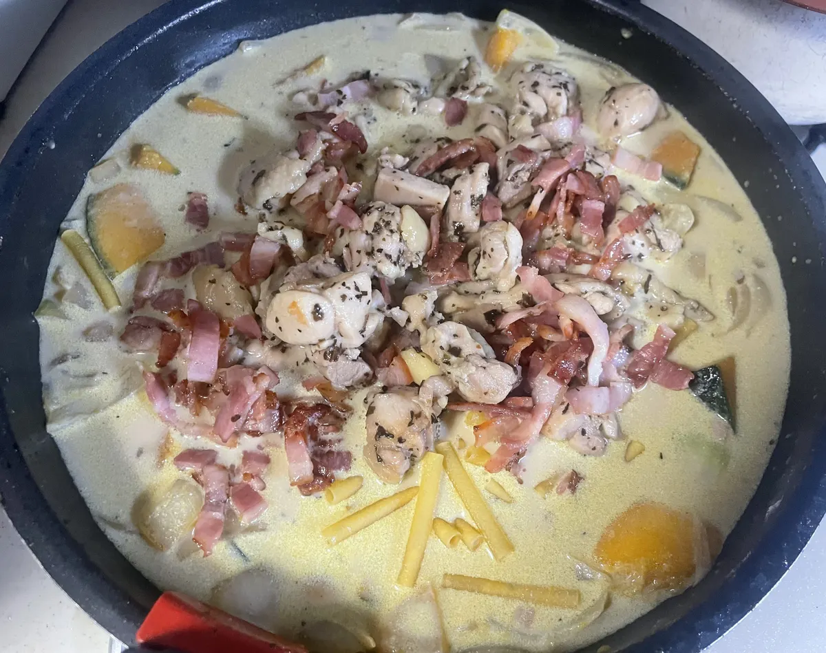 南瓜・パンが入る分味は薄くなるけど、ベーコンから出る塩分も考えて今回は敢えてコンソメor鶏がらスープの素やらは足さんかったのぉ〜😁🧂👋✨