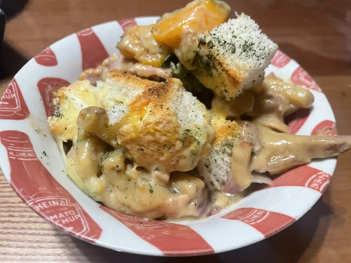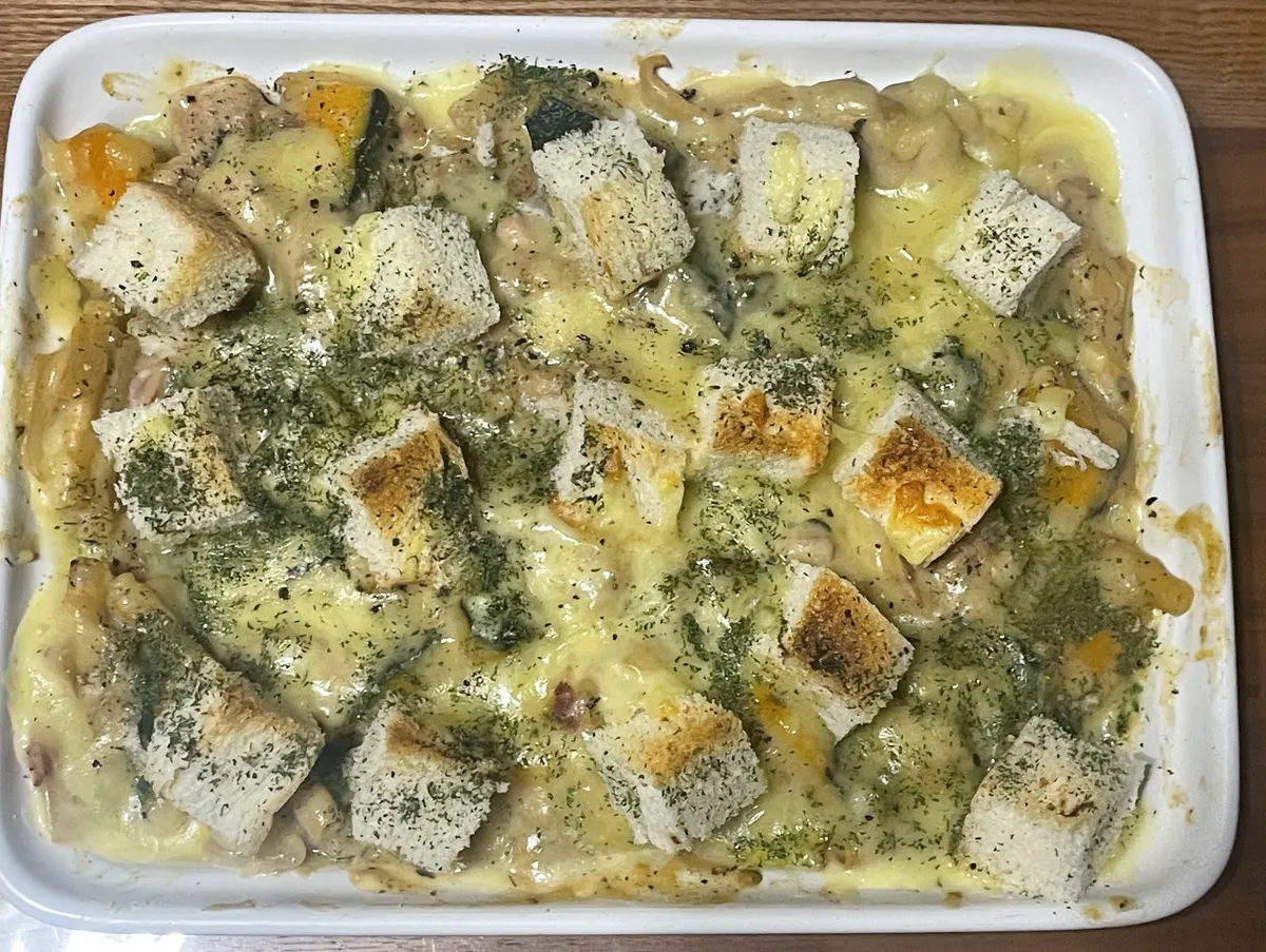【半額南瓜で材料丸無視のパンプキン・ホワイトソースパングラタン🤣🙌🎃🉐🍞🐓🧀✨】
