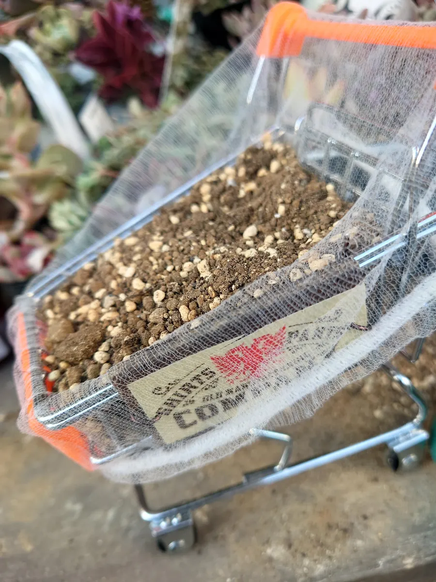 カートのカゴ内に水切りネットをかけて土を入れます(余分なネットは後で切ります)