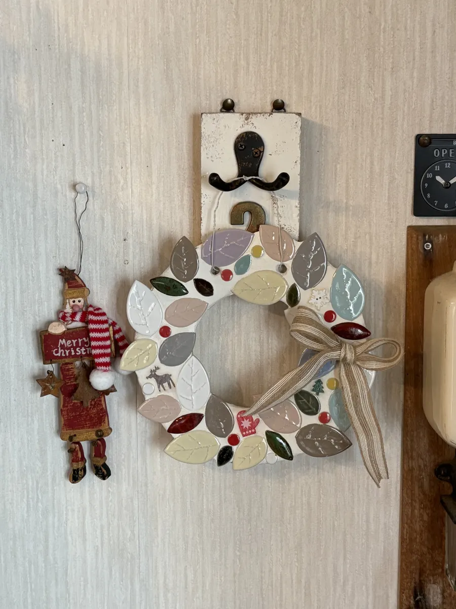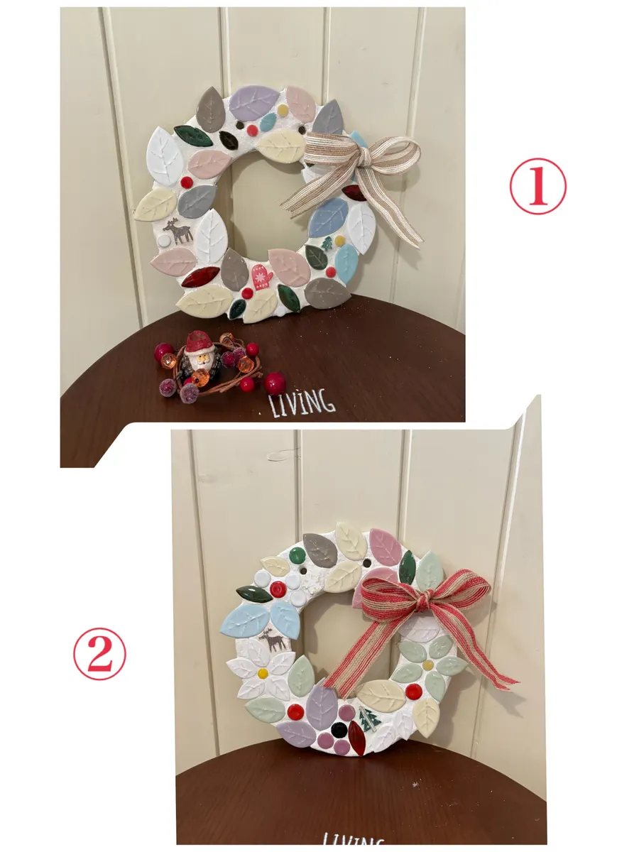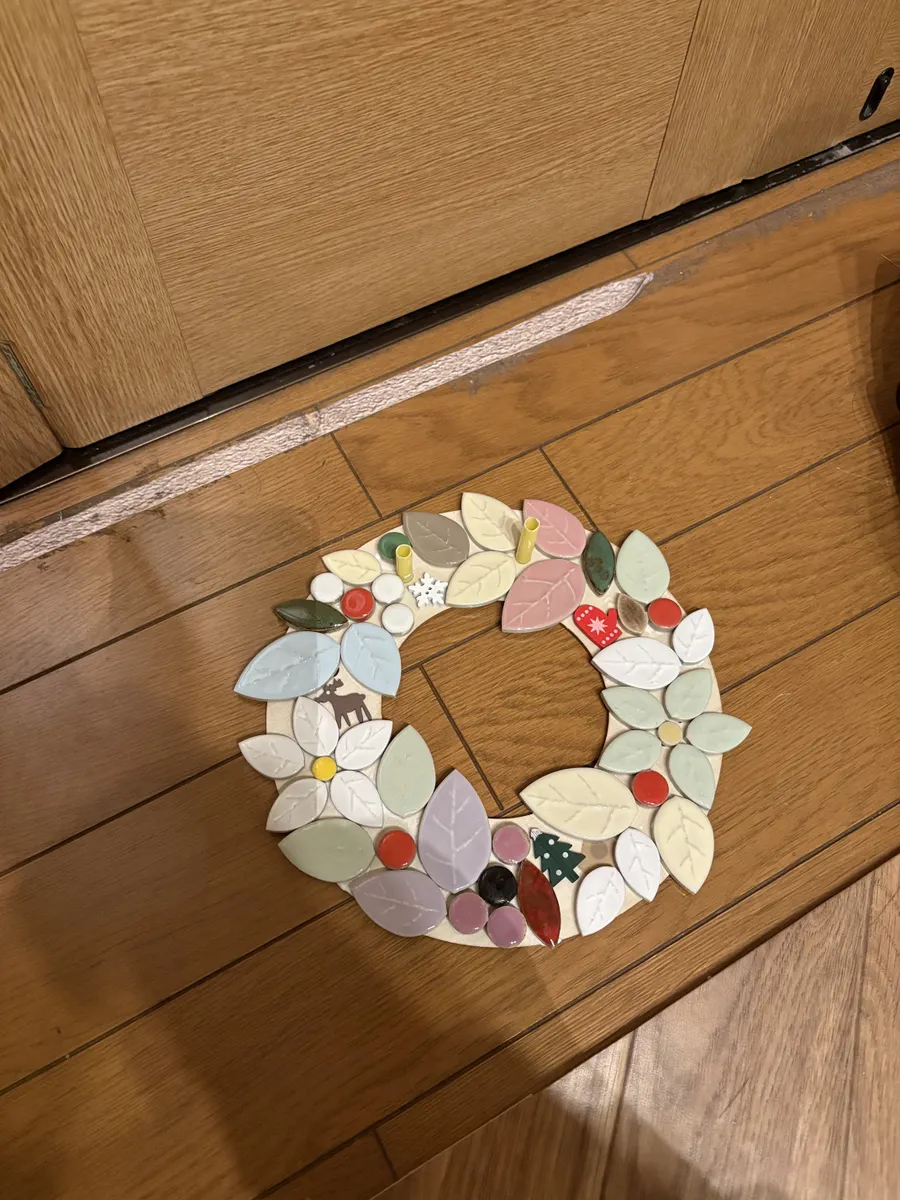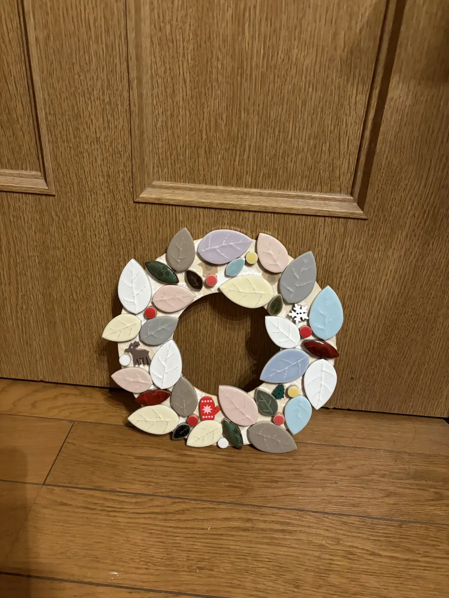 オブジェにも鍋敷きにもなる優れ物!リーフタイルの大きさを組み合わせてリースの丸みを表現するのがなかなか難しかったです。