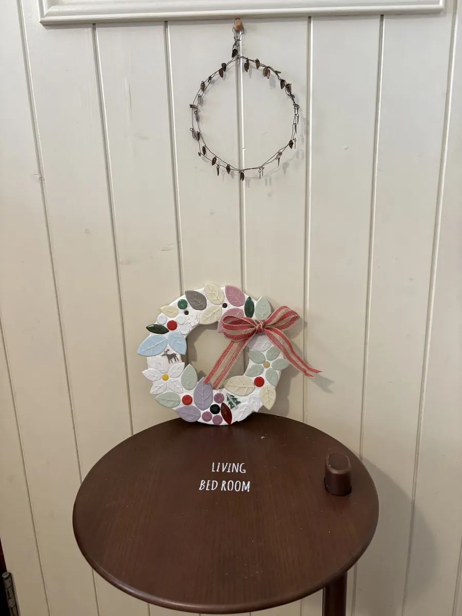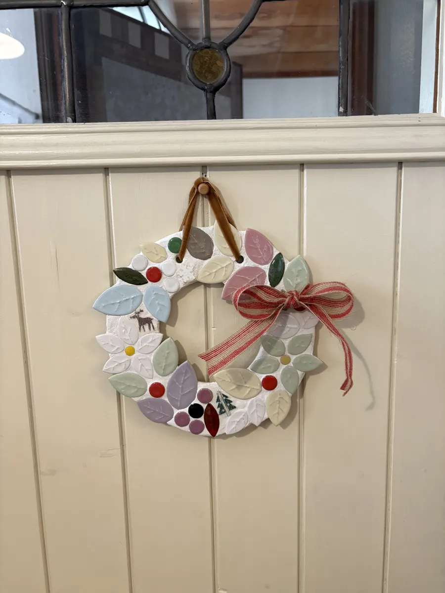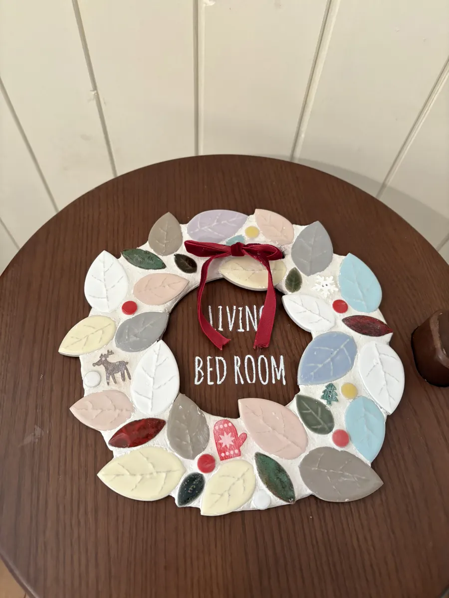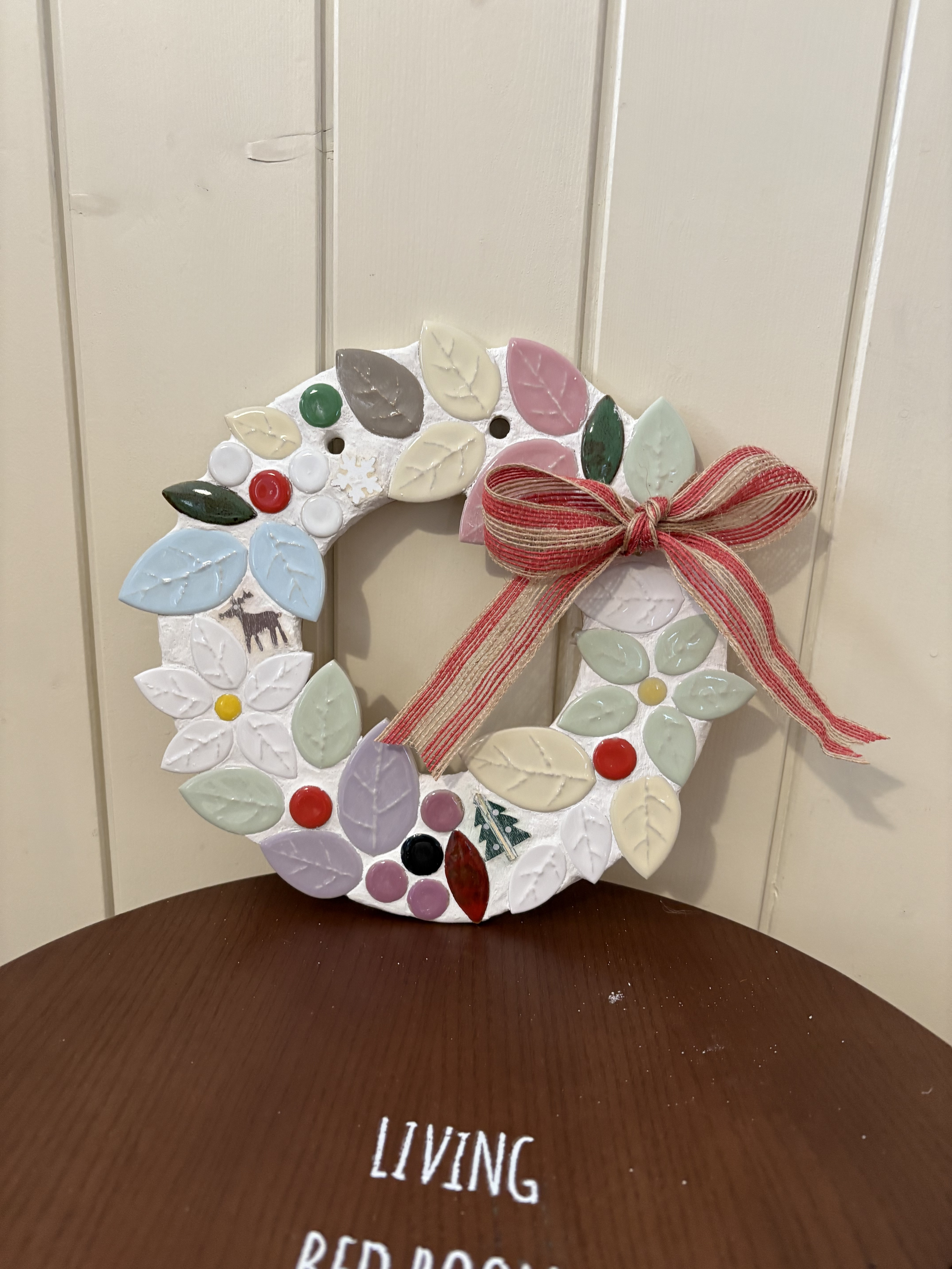 オブジェにも鍋敷きにもなる優れ物!リーフタイルの大きさを組み合わせてリースの丸みを表現するのがなかなか難しかったです。