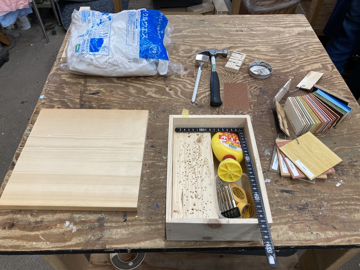 講師よりボード本体にハンマー🔨ミートハンマー、ネジ式ヒートンを使用した見本で説明を受けてボード本体の裏面でダメージして、その後、表面にヒートン以外で取組ました。