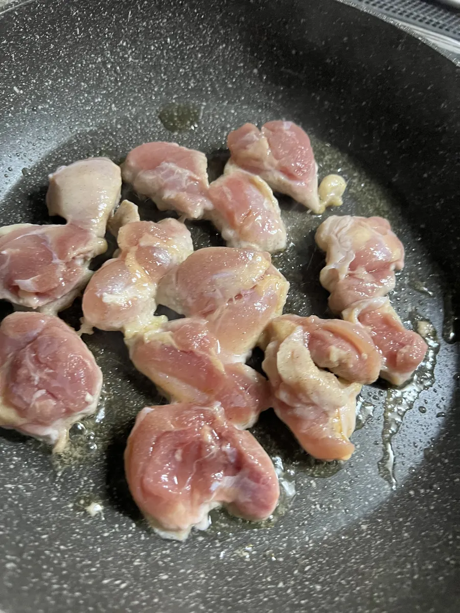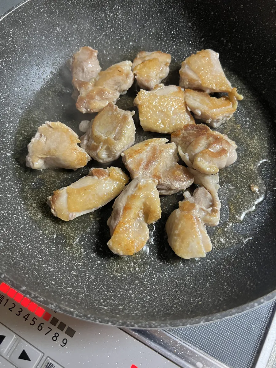 1. 鶏もも肉を一口大に切り、軽く塩こしょうを振る。