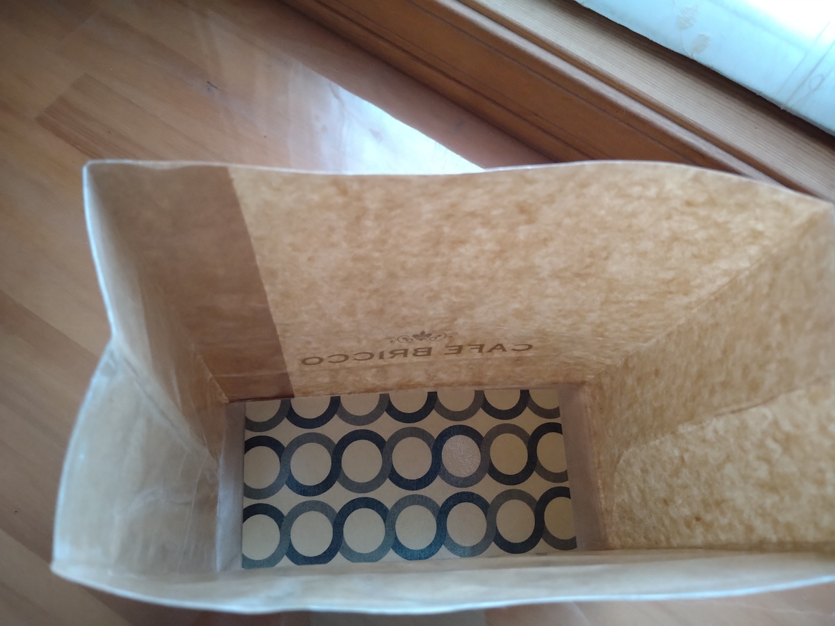 投稿を表示カフェブリッコの袋シンプルで素敵ですよね😊私も気に入ってます🥰フィルムを貼っての再利用いいですね👍✨