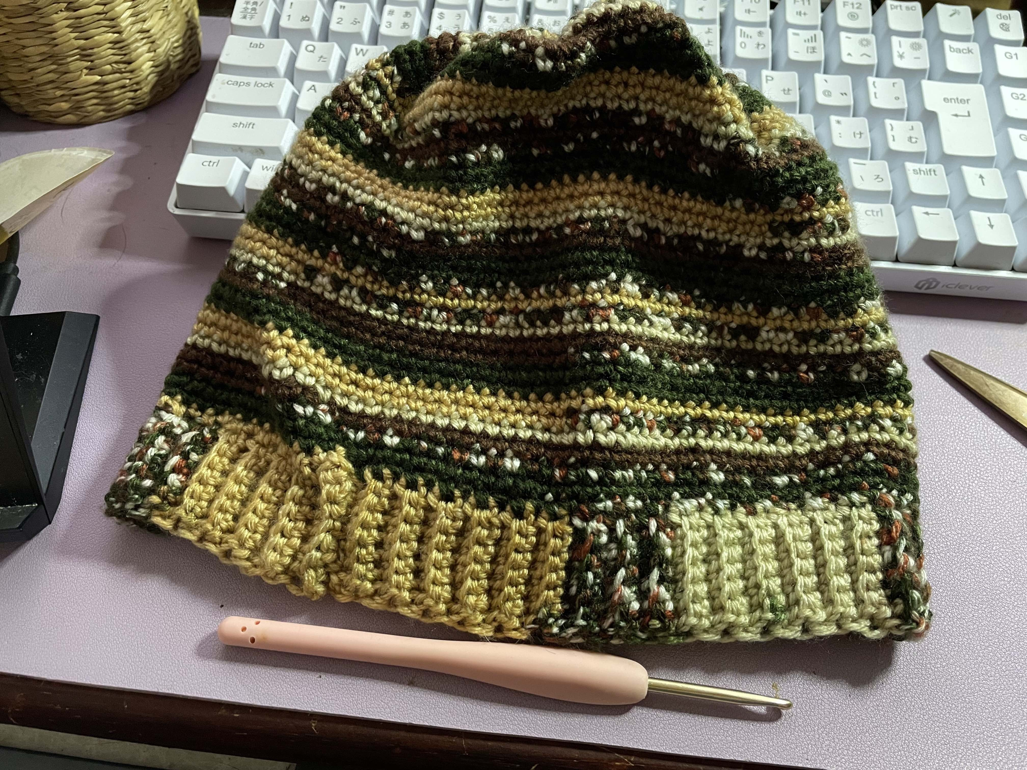 私の夜勤中のちょっとしたレジャーでもあります。これはナスカって言うメーカーの毛糸で編みました。春になったので今からは暑苦しくないコットン糸に替えていく予定。