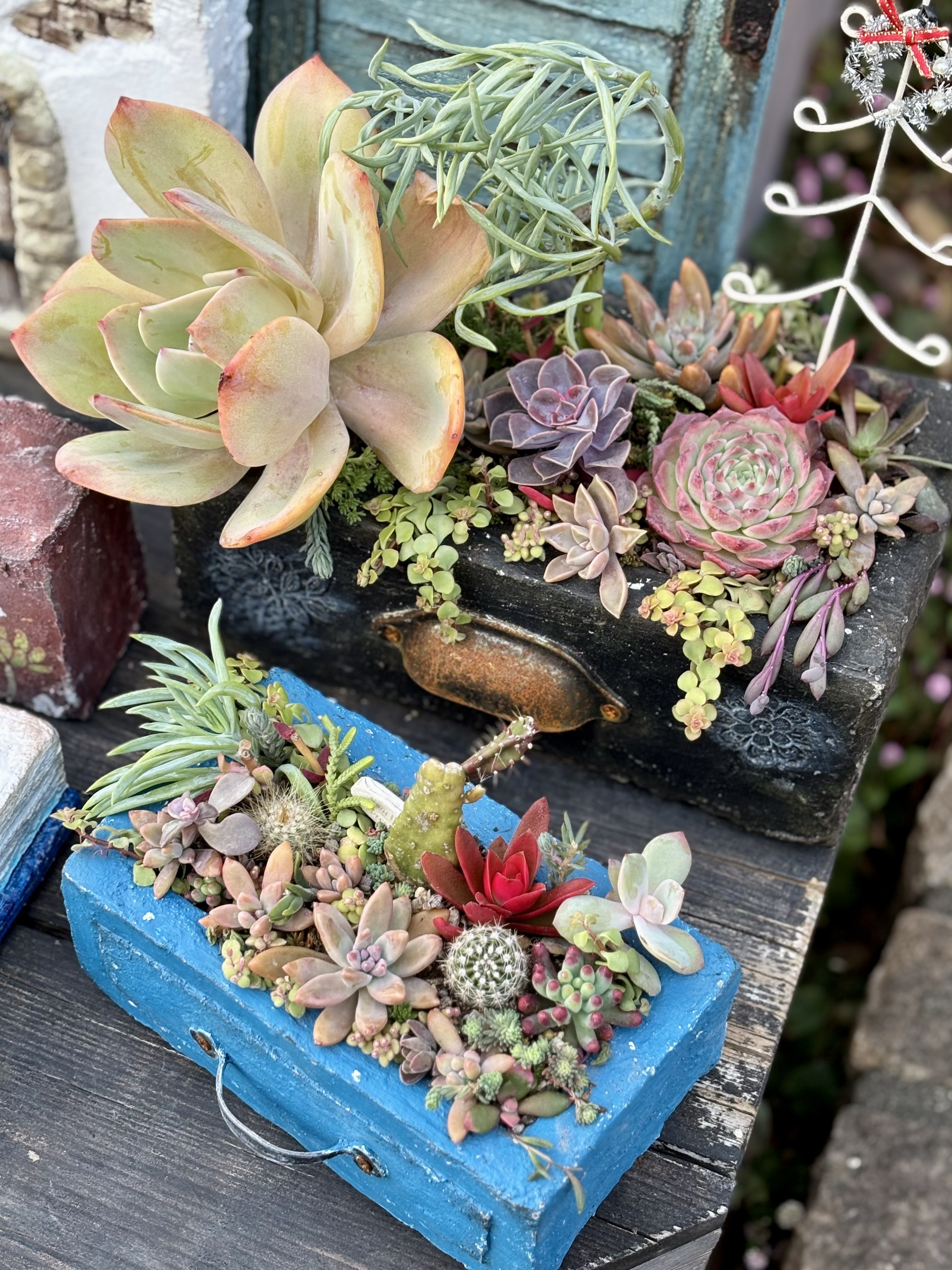 7月にモルタルで作った引き出し型プランターにサボテンと多肉を寄せ植えしてみました🌵🌱