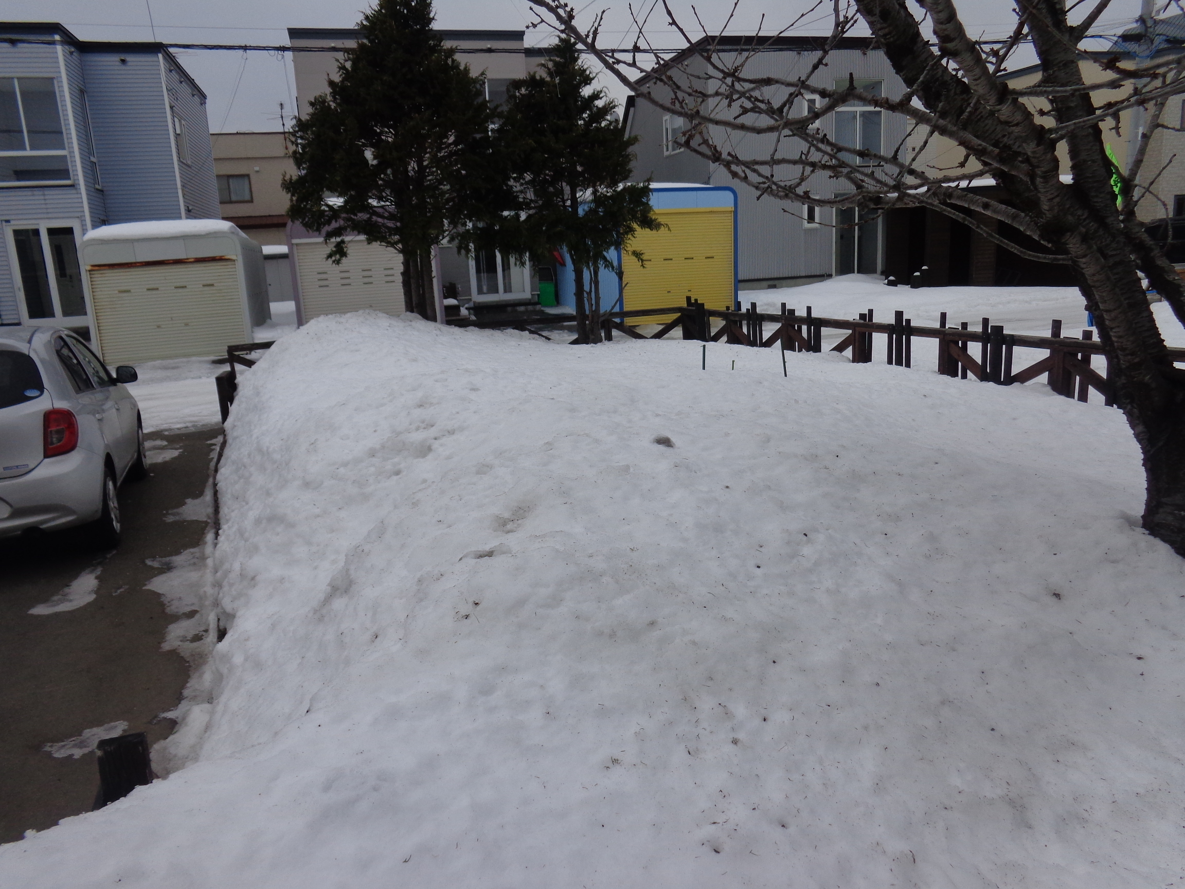 みなさんには笑われてしまいそうですが、これが今朝の我が家の家庭菜園です。およそ1mぐらい雪で覆われています。雪質は先週火曜日に大雪が降った後、気温がマイナスとプラスを繰り返していますので、固くしまっています。今日の仕事は左側が小山のように高くなっていますが、これは駐車スペースの雪を除雪機ではね上げた為です。これを今後の除雪作業のために右に寄せていきます。