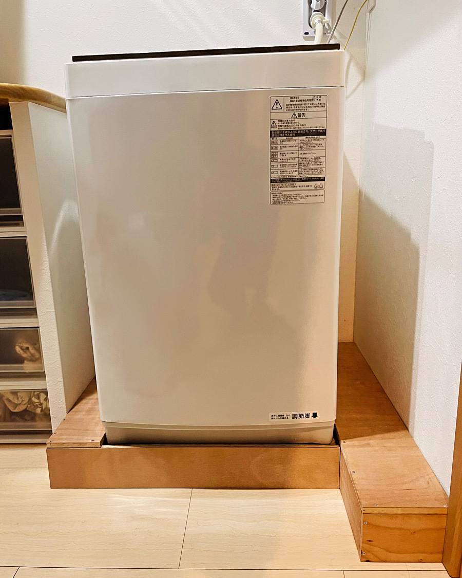 ホースのゴニョゴニョがあると掃除しにくいし埃も溜まってしまっていたけど、板で隠してかなりスッキリしました!洗濯機の下もついでに板で埃が入りにくくしたので、いい感じ(^^)