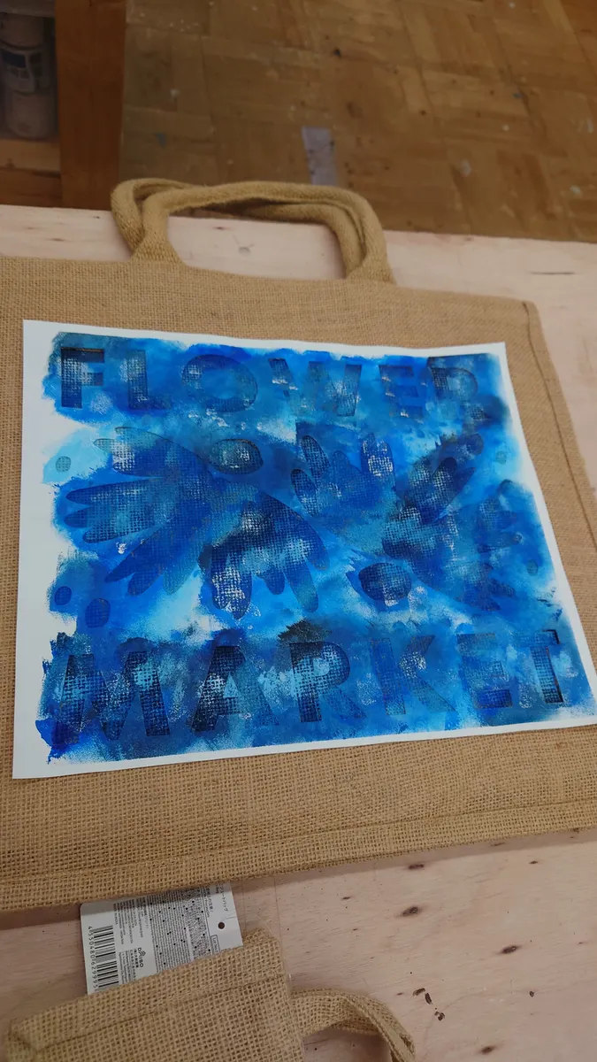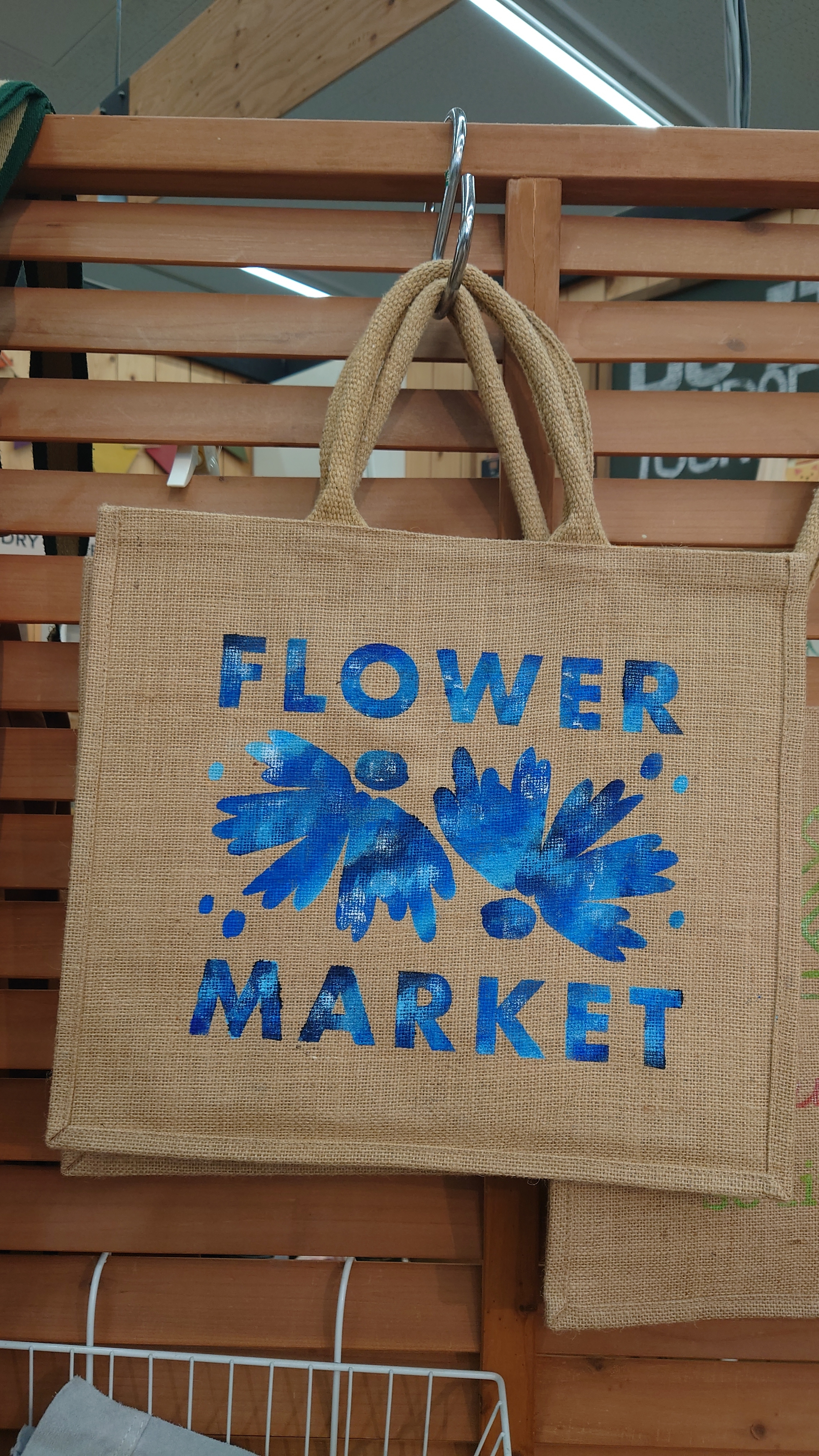 ジュートバッグ、青色の迷彩風でとてもステキです👍