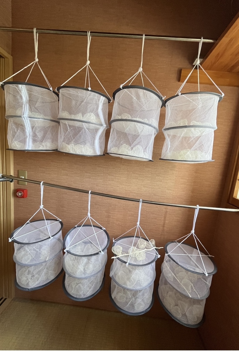 セリアで、野菜を干す網を大量にゲットできたので、風通しのいいところで、日陰干しで、二日くらいですかね🤗