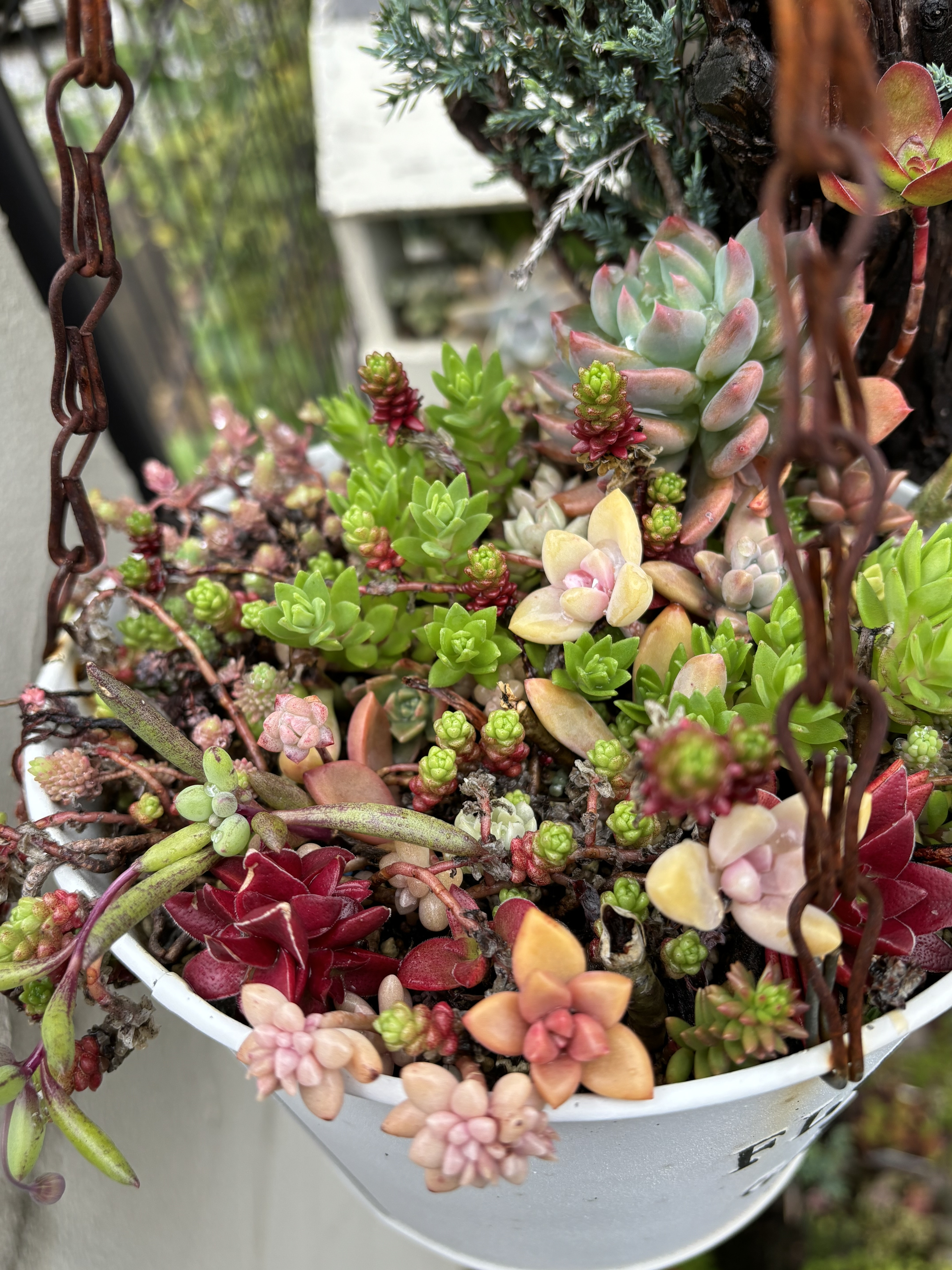 うちにも木に吊るされてる雨ざらし多肉あります🤣置き場所が足らないのもあるけどハンギングって水キレもいいからよく育ちますよね❗