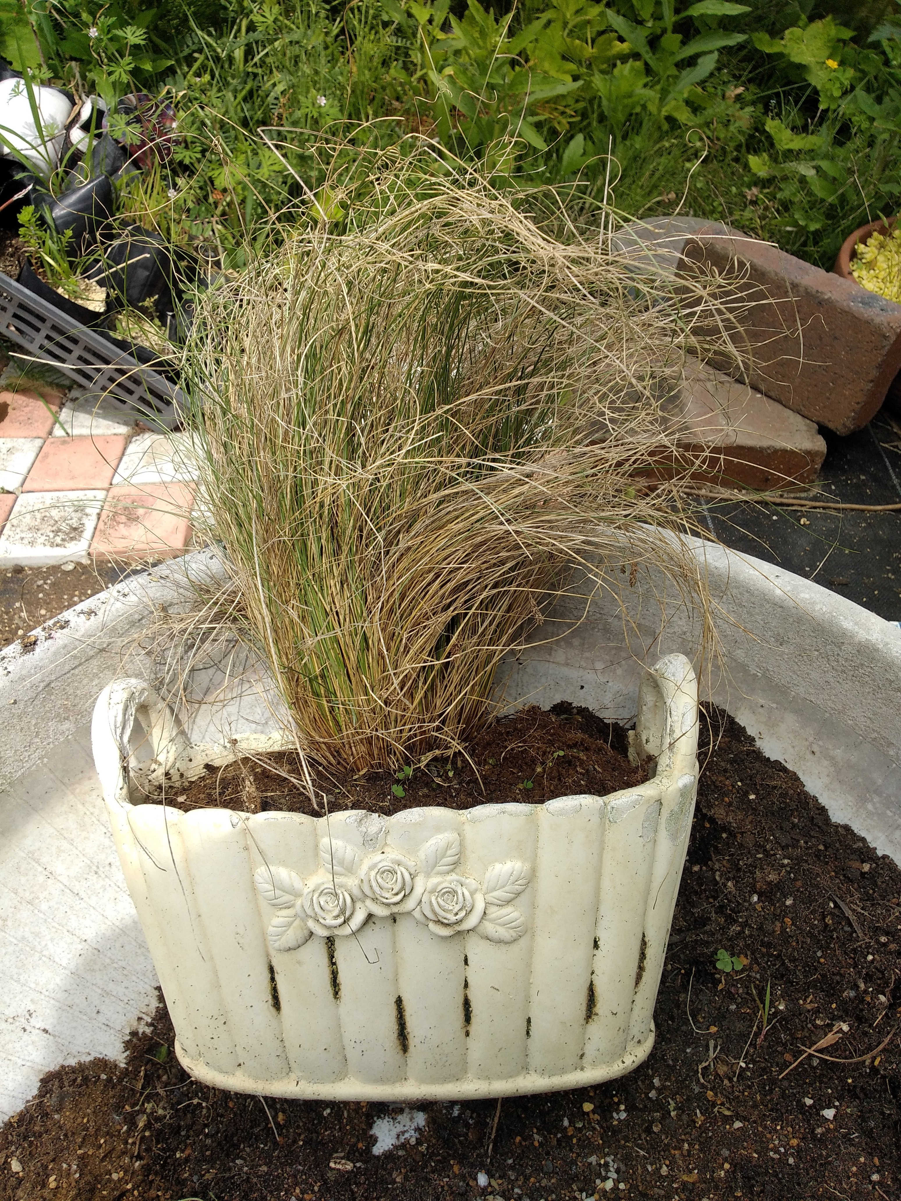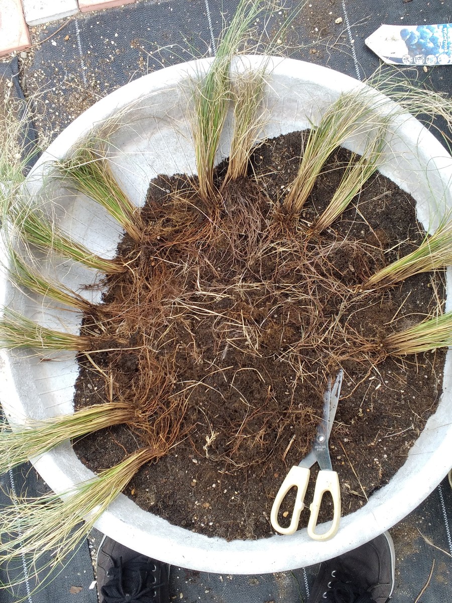 トップ > グリーン > グラスの株分け あにー 2023/05/05 13:39 グラスの株分け 名前はイマイチわかりませんが、今回は枯れた葉が多いので、丁寧に根鉢を崩します。 鉢から取り出し根鉢をはさみで刺して崩す生え際から「うおりゃ~」誰かの真似😆と引き裂く枯れた株をキレイに取り除く12株に分けられましたキレイな培養土に植え付け、根元を押さえ、活性剤入りの水をまく完成です。 株分け時期がちょっと遅れましたが、そのまま放置よりも成長はすると思います! いいね 共有する 共有する X LINE リンクをコピー コメントする 0 件の返信 (新着順)