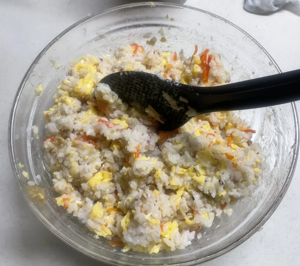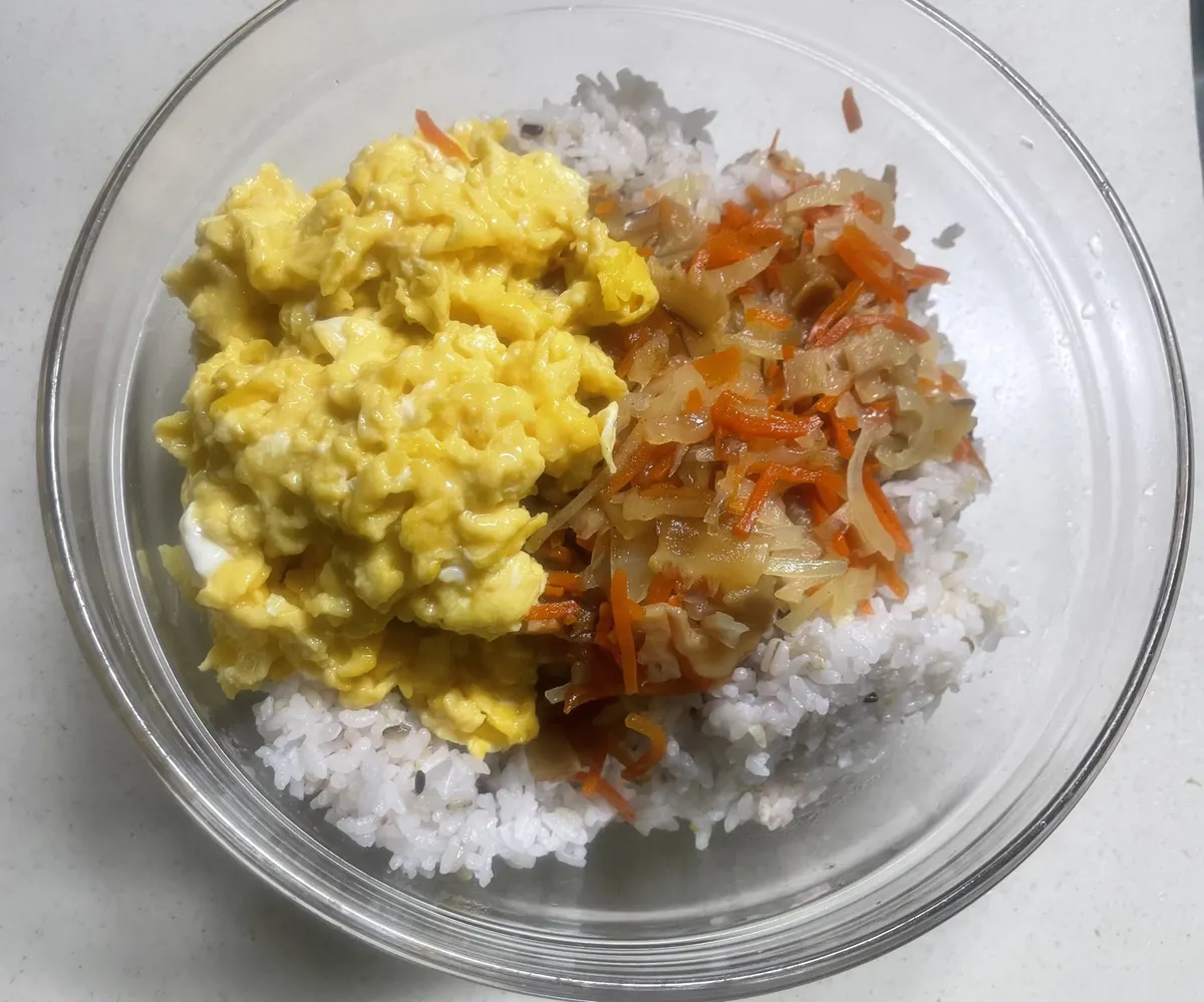 別件で本鮪丼作った五目寿司の繋ぎものに焼いた鮭を解して入れよぉ〜😁👍🐟➰🥣✨