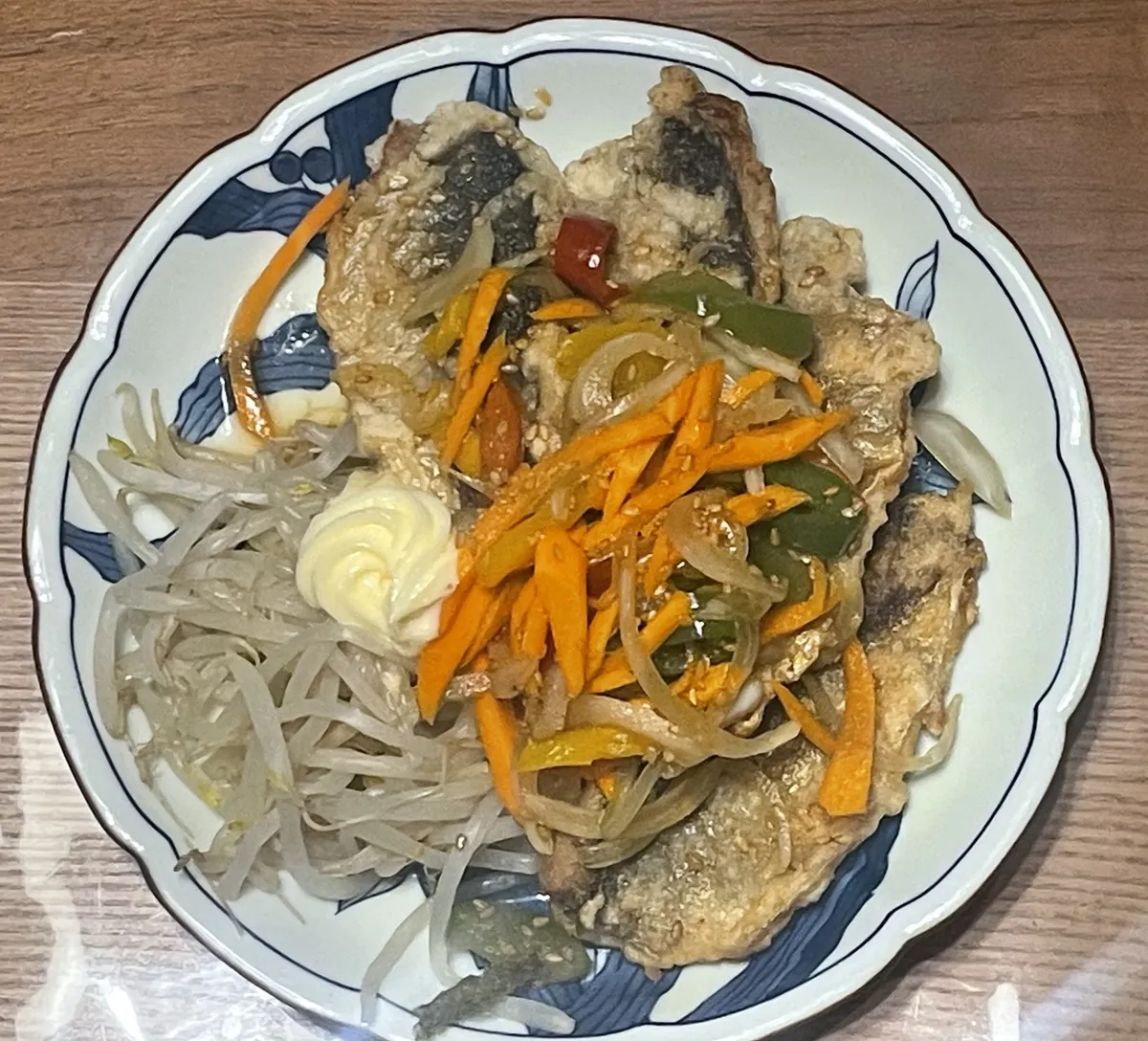 この日はダブルお魚飯で鯵フライ用の下処理済半額仕入れも使って、お野菜もりもりな南蛮漬け風やったったーっ🤩🙌🐟🉐‼️💨✨