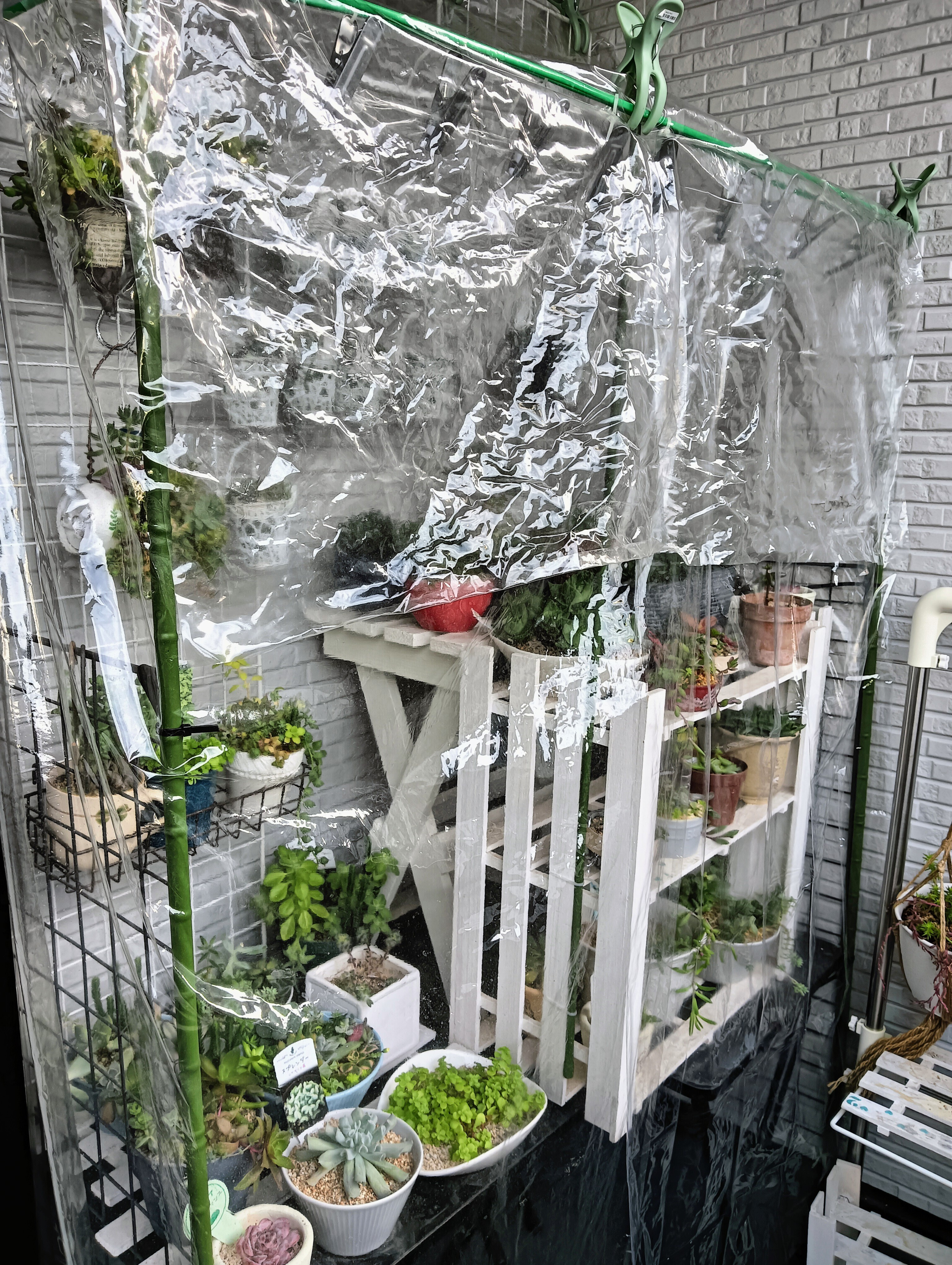ベランダ多肉の冬越し、洗濯バサミのビニールカーテン。