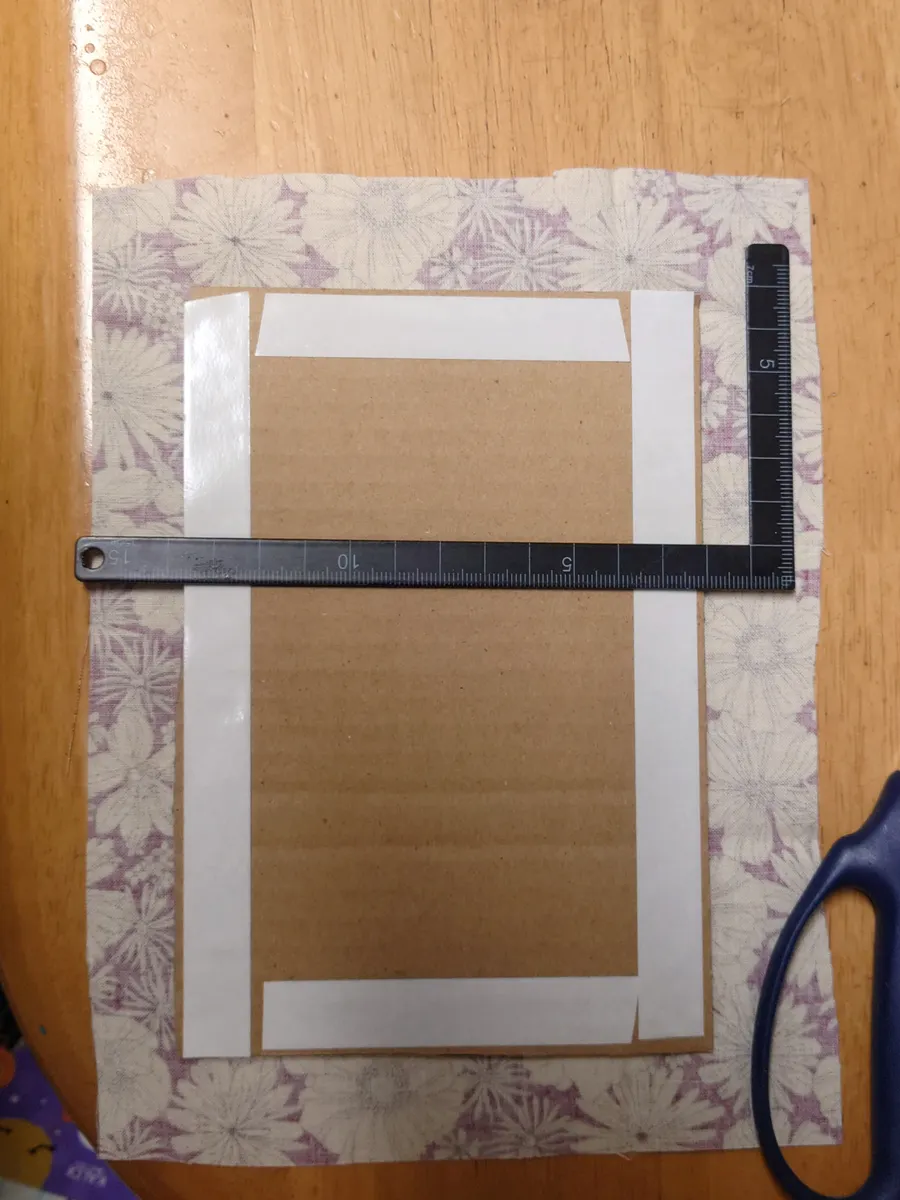 カットクロスをシワが寄らないように貼り付けて周りを2センチ程度にカットして折りたたんで裏側に付ける