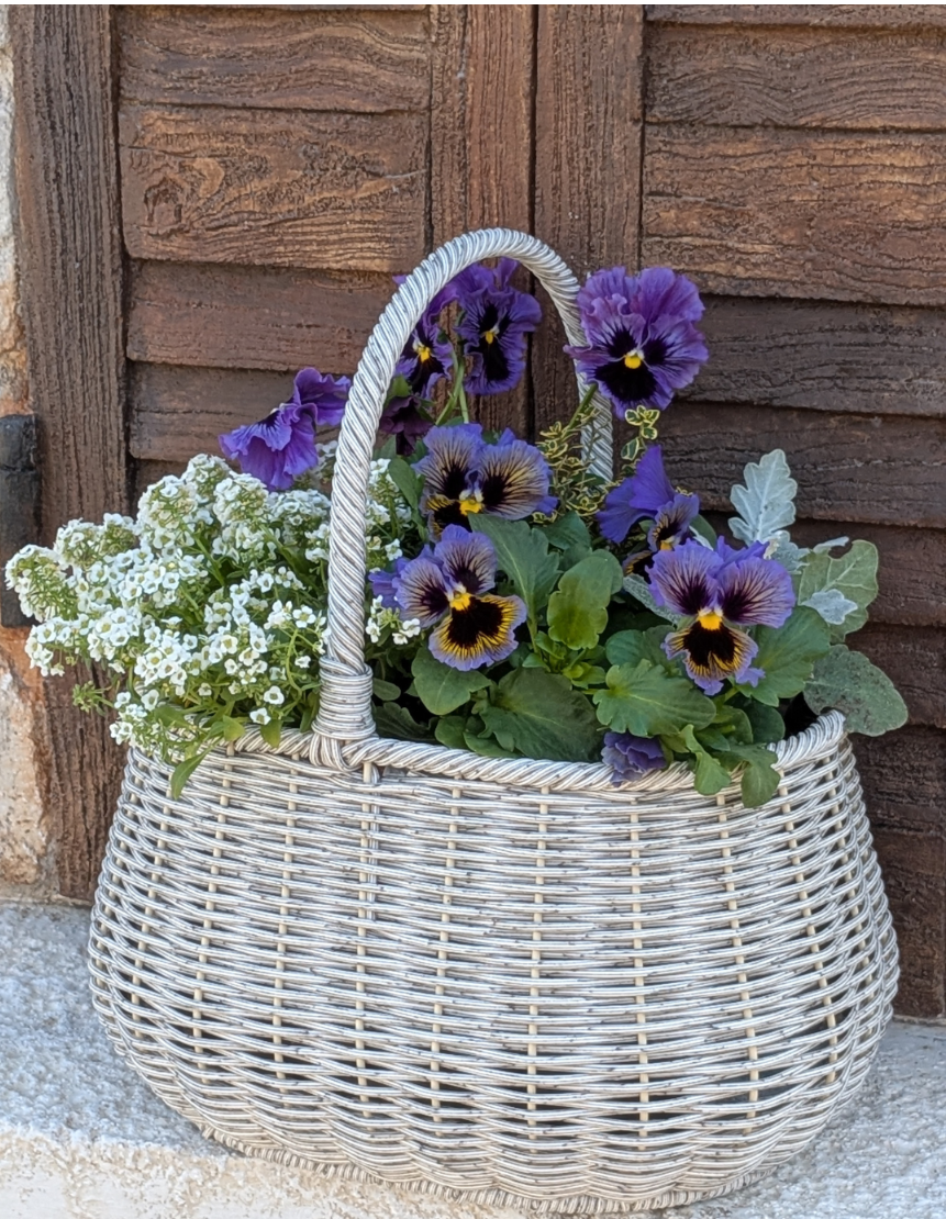 ふんわりした花びらが可愛いです💕シロタエギクとアリッサムがシンプルだから、パンジーを引き立ててくれてますね。籠もとっても似合っていて素敵よ〜😉✨