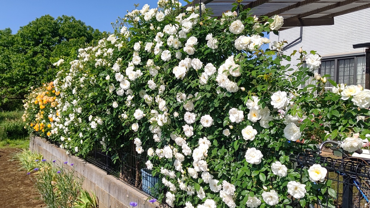 アイスバーグ・サハラ'98・バフビューティーとフェンス一面咲きました