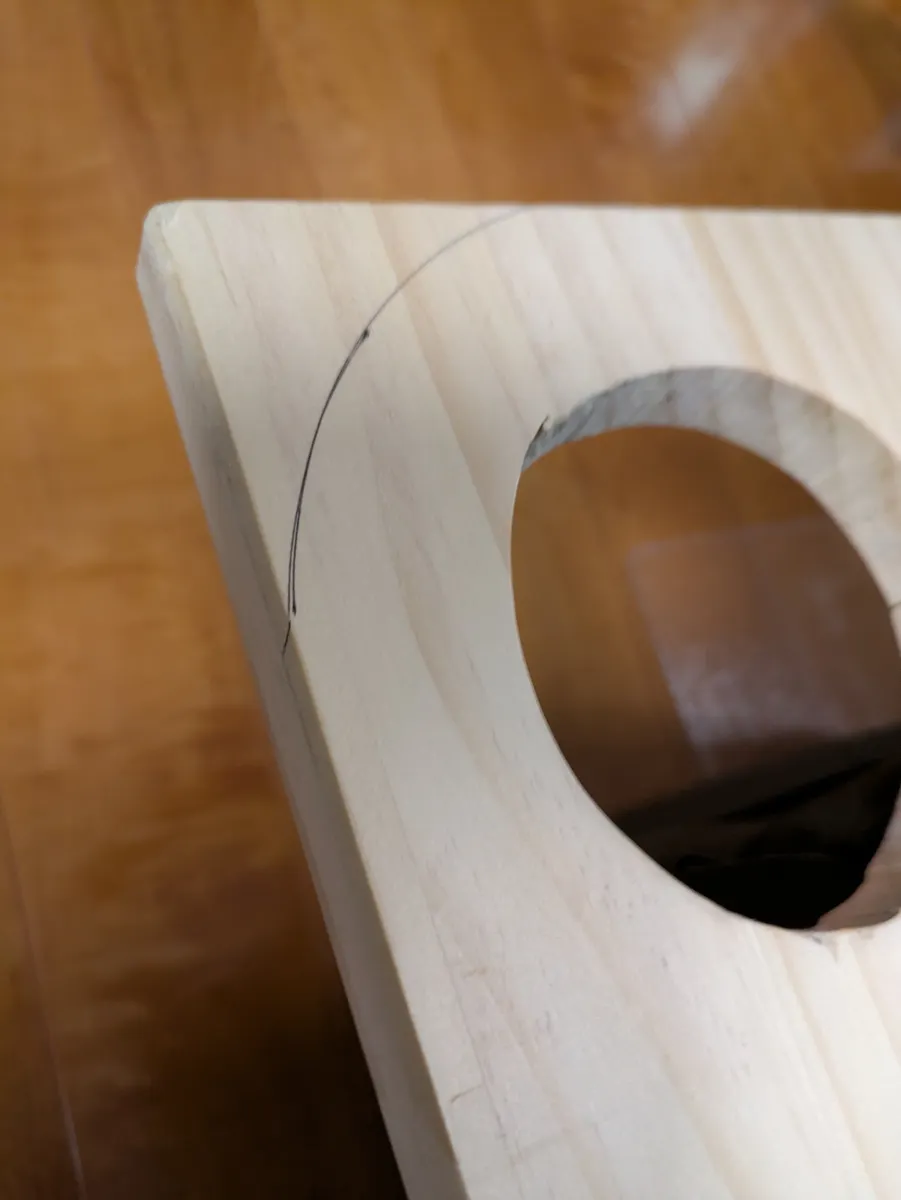 パイン集成板をカットして、ジグソーでカップホルダーを置く穴を開け、車に仮置いてみると角が邪魔と旦那からクレームが😅