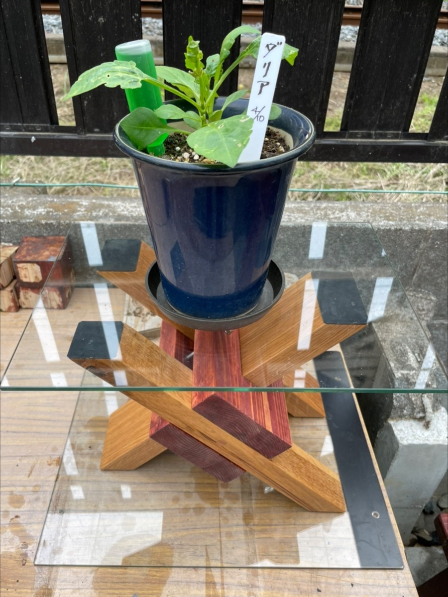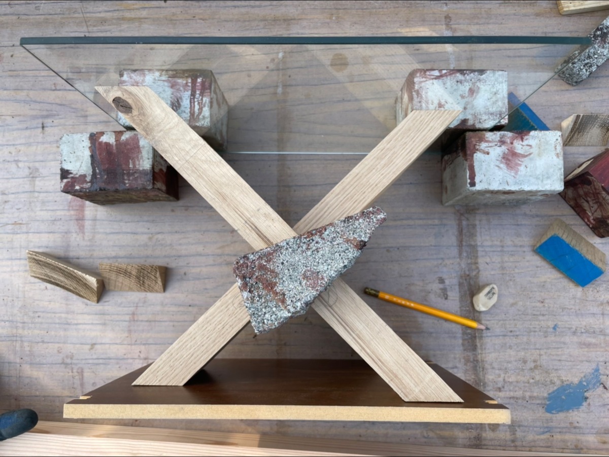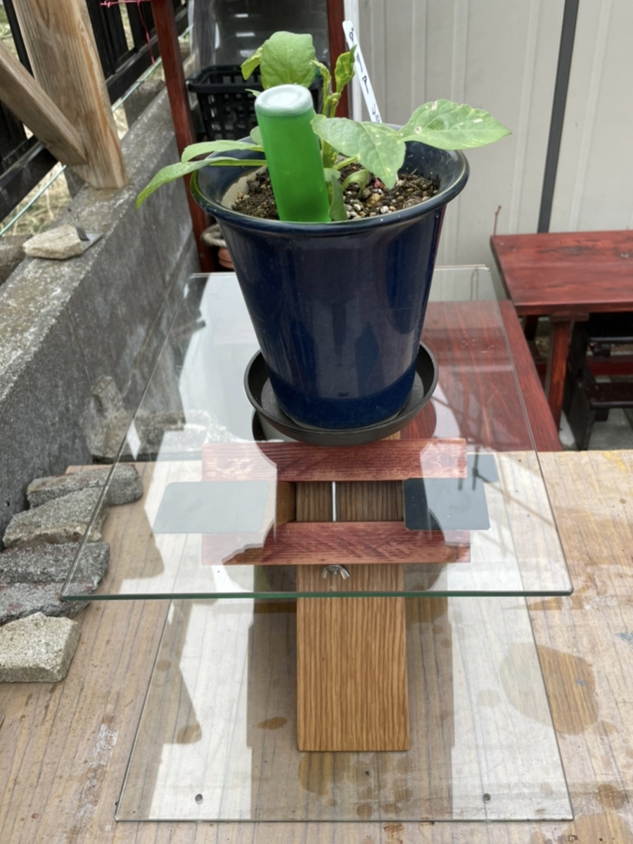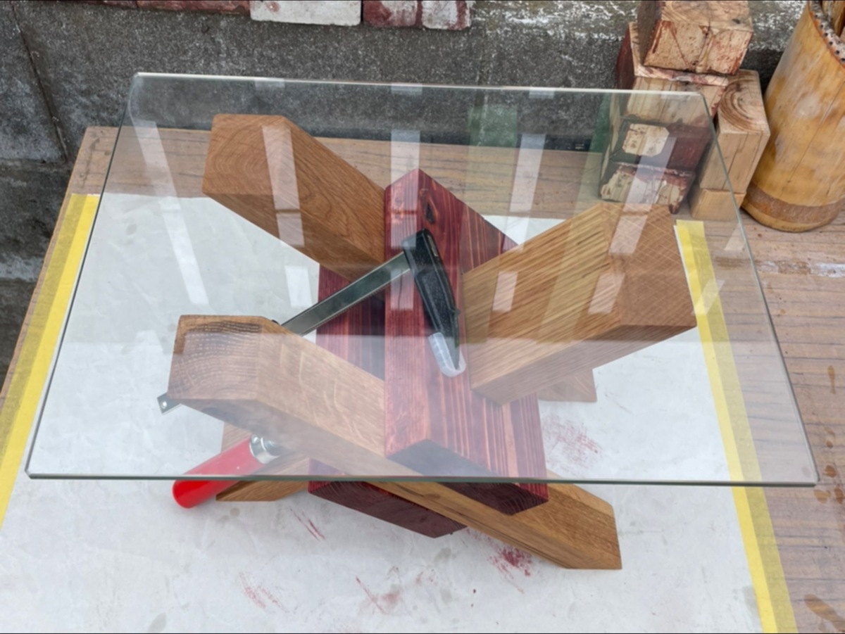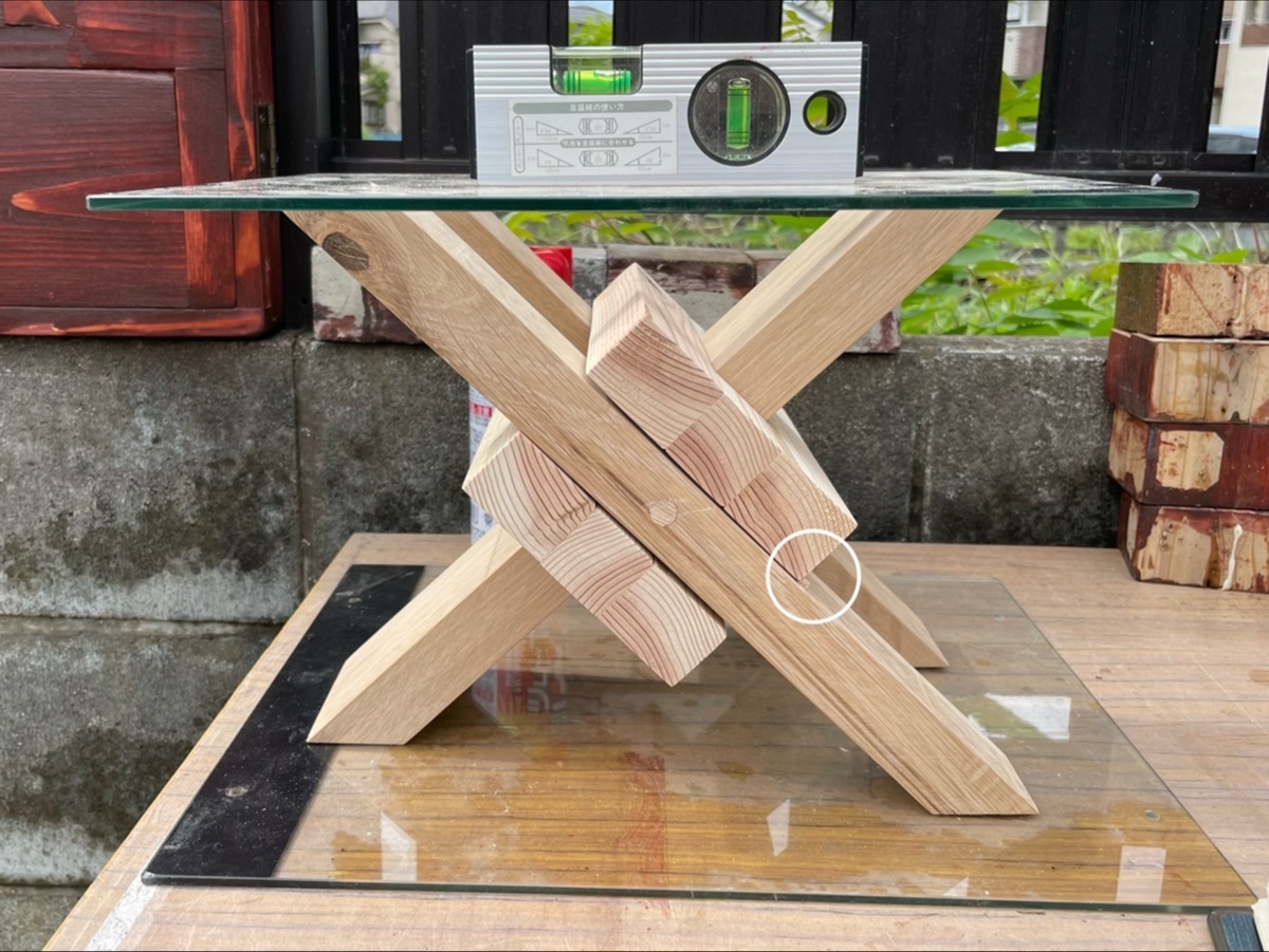 ホワイトオーク端材3枚をX(エックス)状に組んで、ガラス板を乗せます。