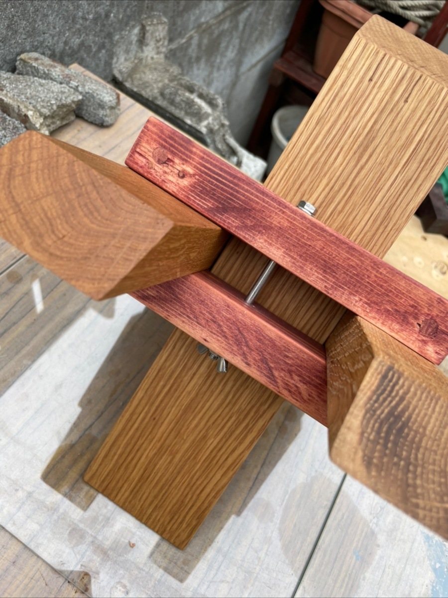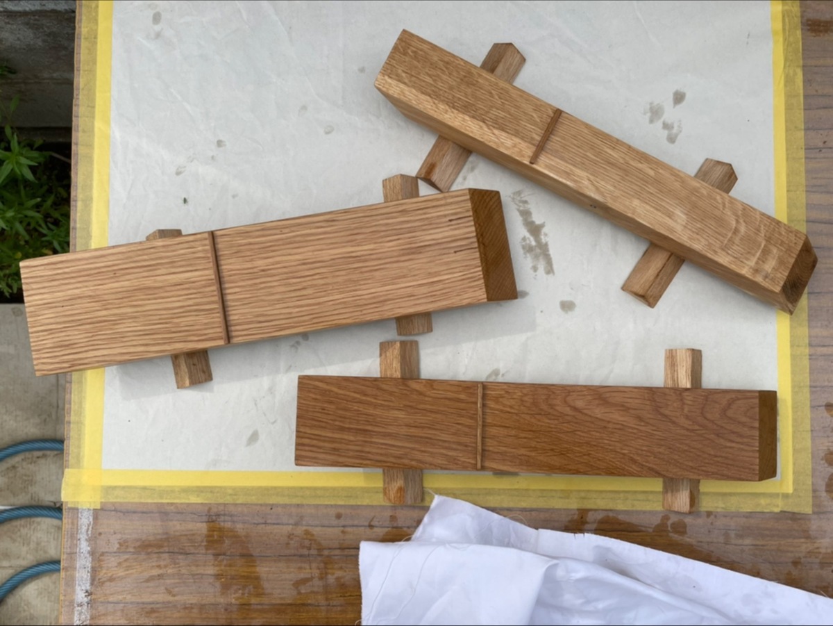再度組立てですが、、オイルフィニッシュのせいか滑ってしまって木材のテンションが上手く掛かりません。そして、ホワイトオークは非常に重い材なので、更にテンションが掛からない要因かと思われました。