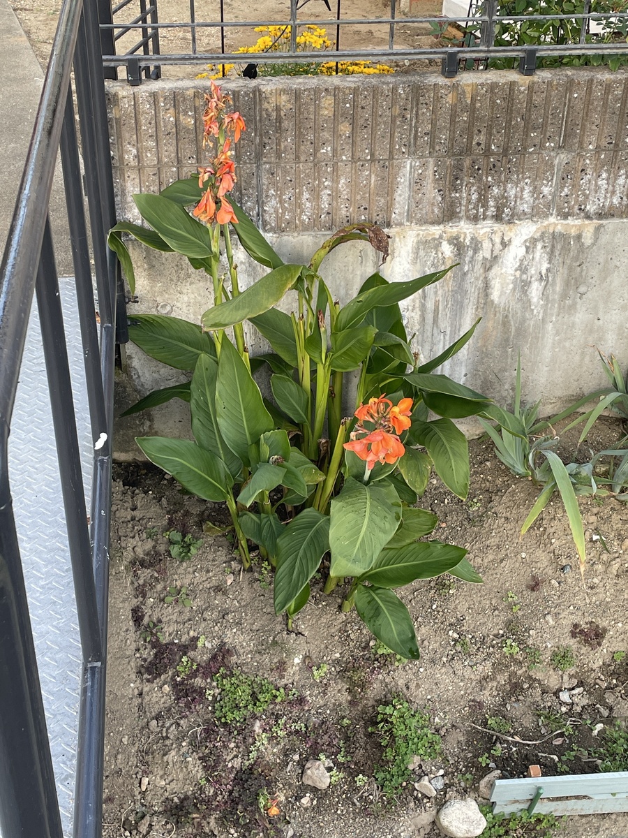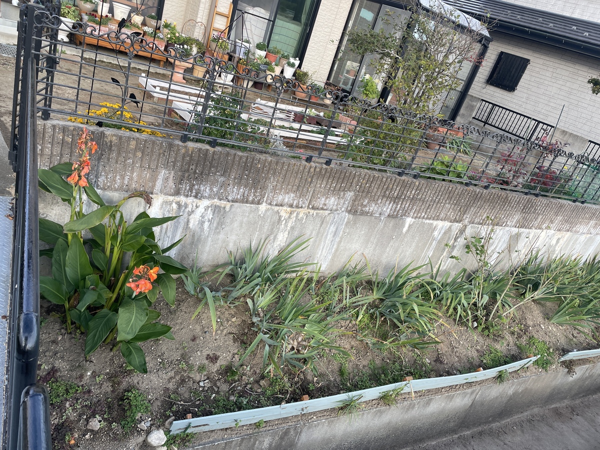 庭の向かい側の土手にはジャーマンアイリスとカンナを植えています。